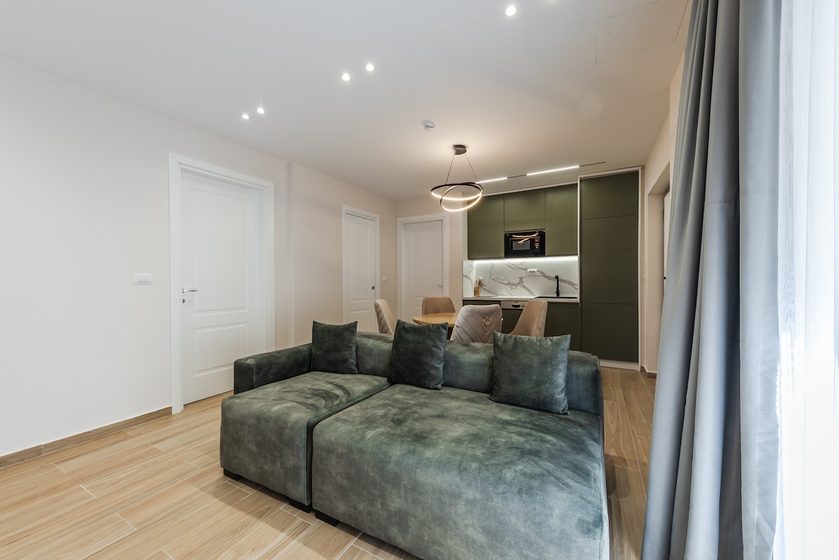 Mūsu luksusa dzīvoklis atrodas augstākās ēkas 15. stāvā un ir moderna dizaina meistardarbs! Ar elegantajām mēbelēm un pārdomāto ergonomiku katrs stūrītis izstaro stilu un komfortu. Iedomājieties, ka malkojat savu iecienītāko dzērienu elpu aizraujošajā plašajā balkonā, baudot saulrietus un saullēktus. Turklāt no guļamistabas logiem paveras apburošs panorāmas skats uz nebeidzamo Adrijas jūru. Katrs mirklis, kas pavadīts šajā dzīvoklī, liks jums sajust prieku un gādātu par to, lai jūsu atvaļinājums būtu neaizmirstams!