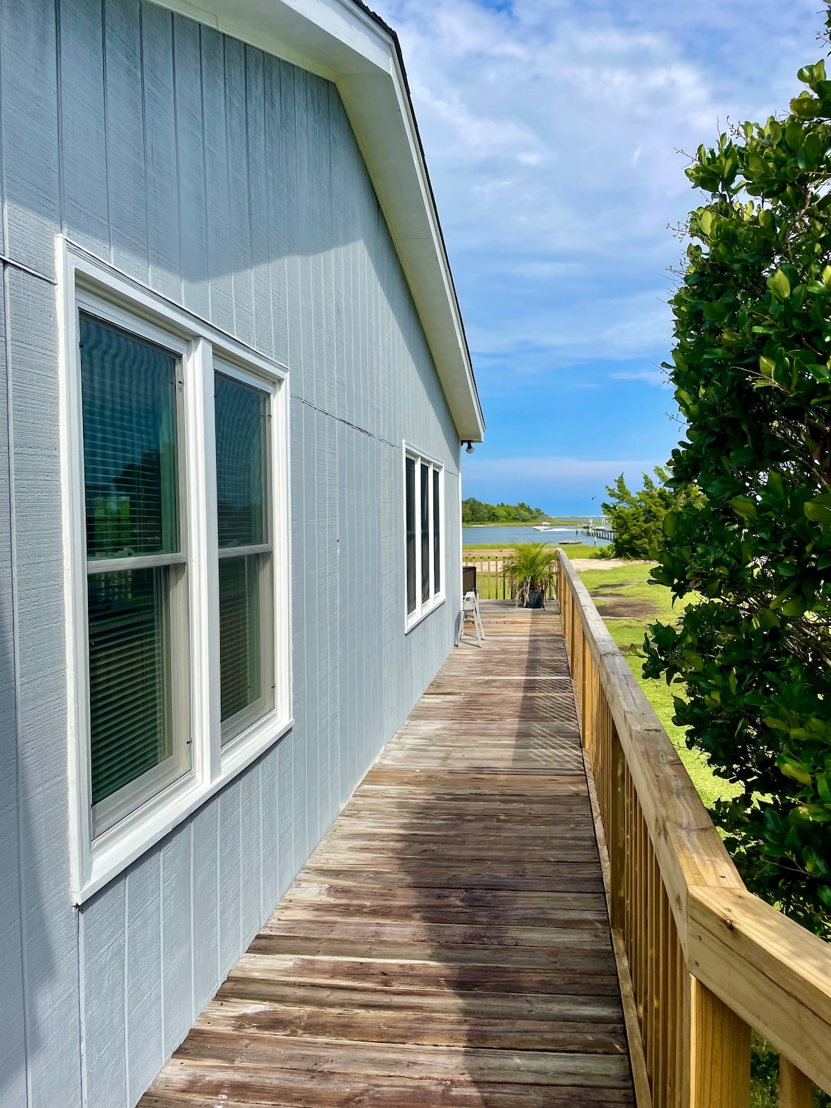 Enjoy waterfront views and relax in this comfy house nestled along the Intracoastal Waterway and the Masonboro Island Reserve. Water views from inside the cottage, outside on the deck, sitting at the fire-pit, playing in the yard, or on the hosts' private pier. You can see lots of boats, a wide variety of native wildlife, sunrises, and more. On the pier you may fish, lounge, launch your kayak, paddle board, etcetra. 10 - 20 minutes from the beaches, board walks, fine dining, boating, and more