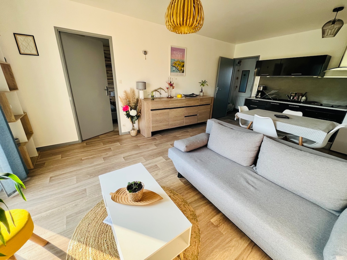 Šis skaistais atjaunotais dzīvoklis atrodas 1,5 km attālumā no pludmales, un tā ir ideāla vieta brīvdienu pavadīšanai. Tā atrodas klusā un mežainā rezidencē, un tajā var apmesties līdz 4 cilvēkiem un 1 mazulim. Sastāvs: vestibils, viesistaba ar minivirtuvi un atpūtas zonu, guļamistaba ar divguļamo gultu, vannasistaba, tualete, veļas mazgātava, terase un autostāvvieta. Tuvu visiem veikaliem: maiznīcas, lielveikali, tabakas prese, miesnieki, kreperi, picērija...