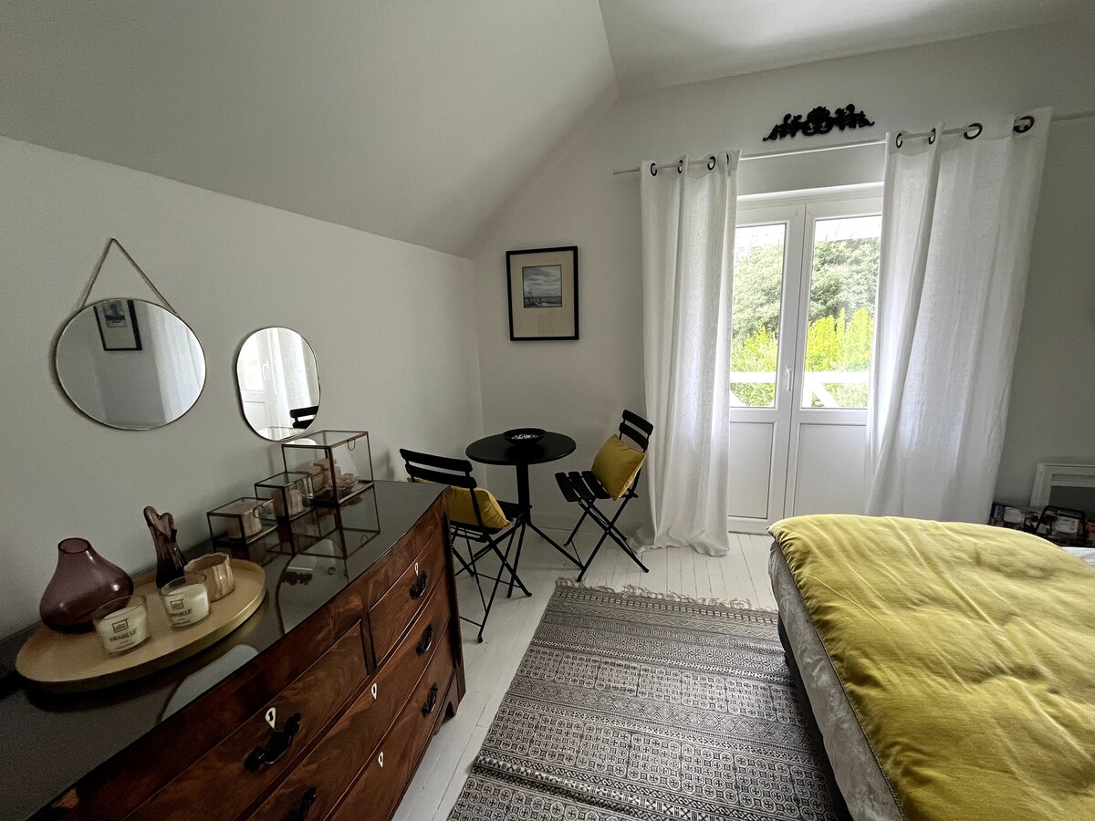 Izbaudiet ērtu viesu istabu pilnībā renovētā mūra mājā, lauku klusumā un netālu no jūras. Vannasistabā ir vanna un duša, un jums ir piekļuve saunai. Mēs piedāvājam gardēžu dēļus pēc rezervācijas (sazinieties ar mums 48 stundas iepriekš). Jūsu rīcībā ir arī koplietošanas telpa (izņemot ēdienreižu laikā galdus d 'hôtes). Īpaša mājsaimniecība.
