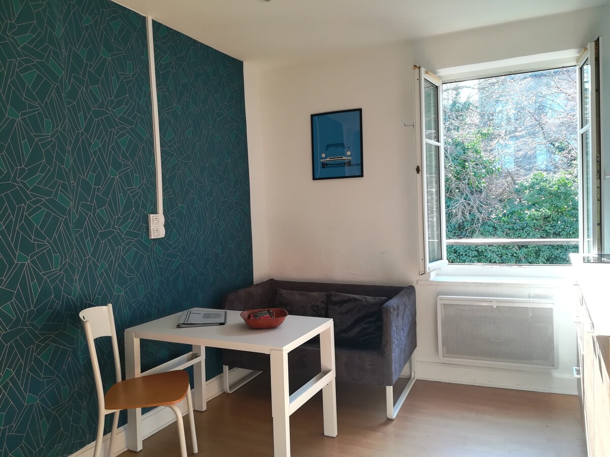 Pilnībā renovēta studija ar privātu terasi, kas atrodas pirmajā stāvā un ir neatkarīga. Mājoklis atrodas ļoti klusā apkaimē un strupceļā. Nav pretēja. Skats uz lauku. Autostāvvieta pagalmā, kas rezervēta naktsmītnei. Neatkarīga un autonoma ieeja ar kodu kastīti. Nesmēķētāju iekštelpu telpa. Ārā ir pieejams pelnu trauks.