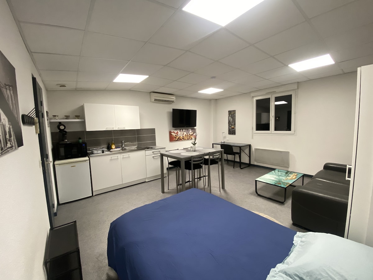 Silta studija 40 m² platībā. Tieša piekļuve pa nelielo terasi no tuvējās autostāvvietas. Vieta, kur dzīvot gan dabā, gan modernā vietā, kur mežainā un krāsainākā atmosfēra mijas ar mājīgāku stilu. Tas ir vienkāršs, funkcionāls un modulārs, lai ikviens varētu atrast savu kontu atbilstoši uzturēšanās vajadzībām. Kluss un drošs dzīvoklis. Tā atrodas blakus, un es bieži atrodos savā vietā. Ja jums kaut kas ir nepieciešams, varu būt pieejams.
