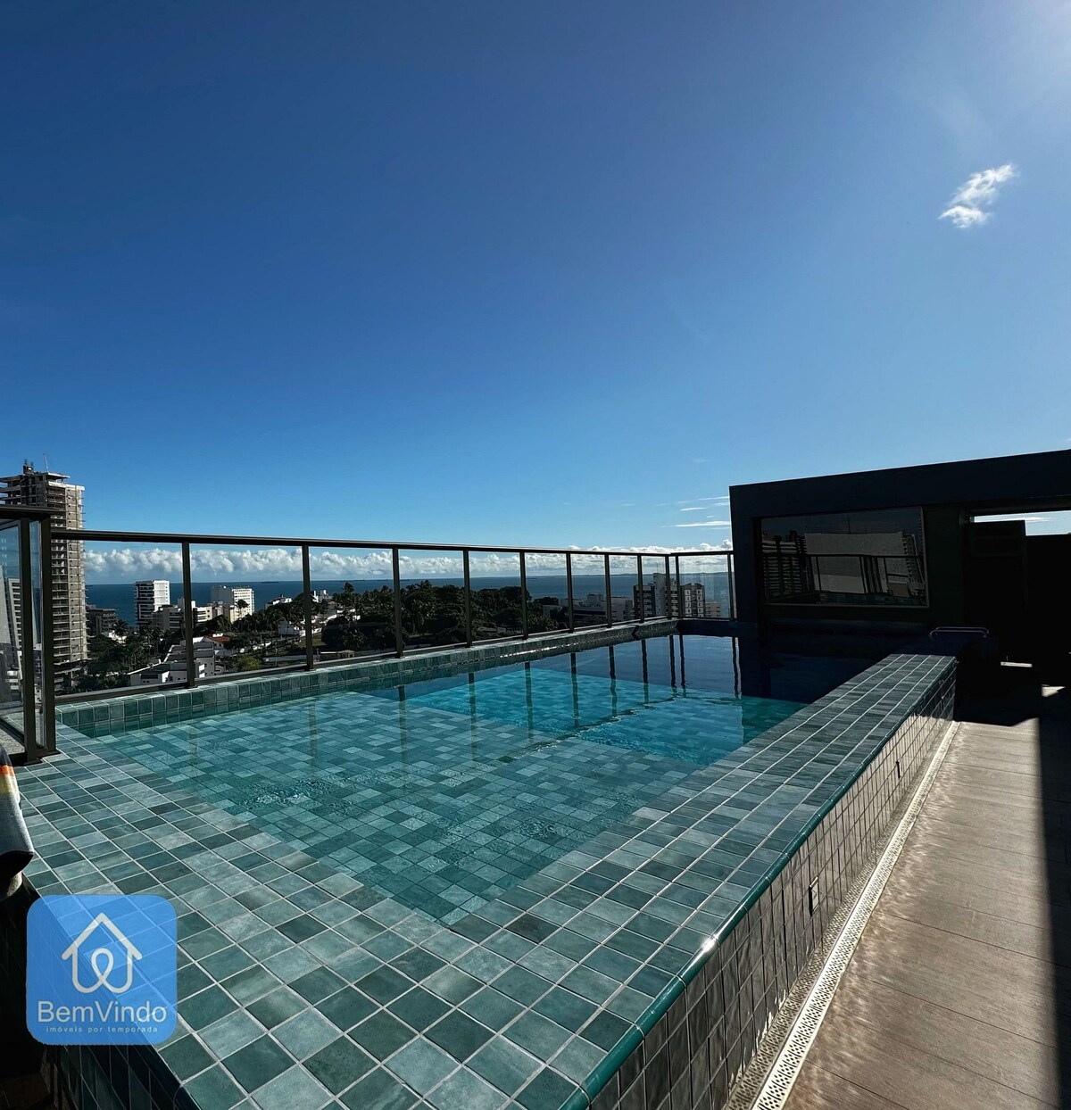 Dzīvoklis ar iespaidīgu skatu uz jūru un ideāli piemērots tiem, kas vēlas apmesties tikai 100 m attālumā no Farol da Barra pludmales ar komfortu, drošību un privātumu! 1 guļamistabas dzīvoklī ir gaisa kondicionētājs, divguļamā gulta, skats uz jūru un garderobe, grezna vannasistaba ar dušu un karstu ūdeni, virtuve aprīkota ar gāzes plīts virsmu, mikroviļņu krāsns, ledusskapis ar saldētavu un cepeškrāsni, viesistaba ar dīvānu un 50collu televizoru. Balkons ir vieta, kur atpūsties, pateicoties kafijas stūrim un krēslam ar skatu uz jūru.