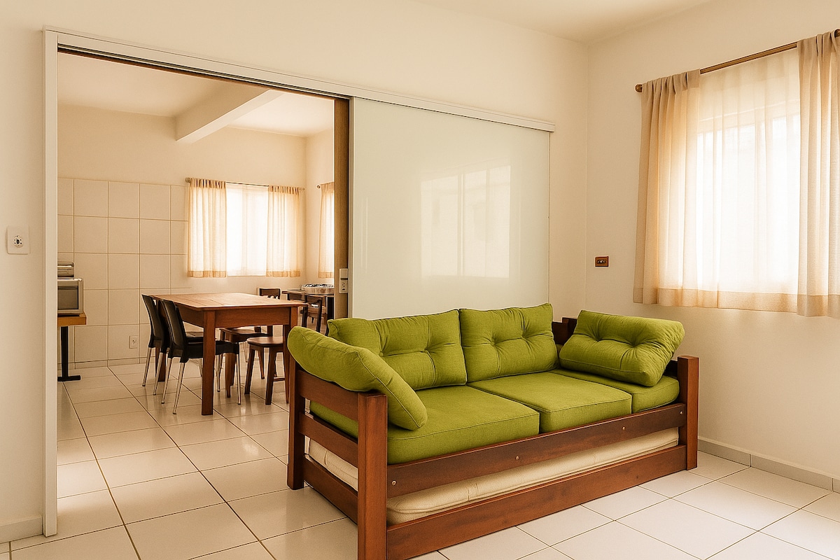 A casa de temporada é composta por 1 quarto/sala com sofá cama e cama auxiliar; 1 quarto com cama de casal e armários, cozinha completa e equipada, 1 banheiro de uso exclusivo, ventiladores e varanda com mesa e rede, além de acesso compartilhado ao tanque, varais, mangueira e utensílios de limpeza. É possível solicitar ferro e tábua de passar gratuitamente. Uma Smart TV está disponível, com acesso livre à Netflix, Max e globoplay. Oferece estacionamento interno compartilhado e WiFi gratuito.