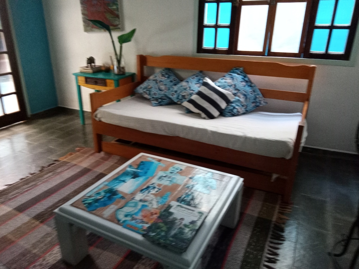 Veca māja ar laivu, kas celta 1950. gados un piederēja vecajai Belvederes viesnīcai, kas atrodas nelielā līcī Sepituba. Šajā viesnīcā mans tēvs pavadīja savu jaunību, pastaigājoties ar kanoe laivu. Mājoklī ir garda enerģija, lai atpūstos un pārdomātu satriecošo skatu uz jūru un Ilhabelu, kas atrodas mūsu priekšā. Tā ir unikāla paradīze! Namaste Mēs pieņemam 1 mīļdzīvnieku katrā uzturēšanās reizē (līdz 20 kg).