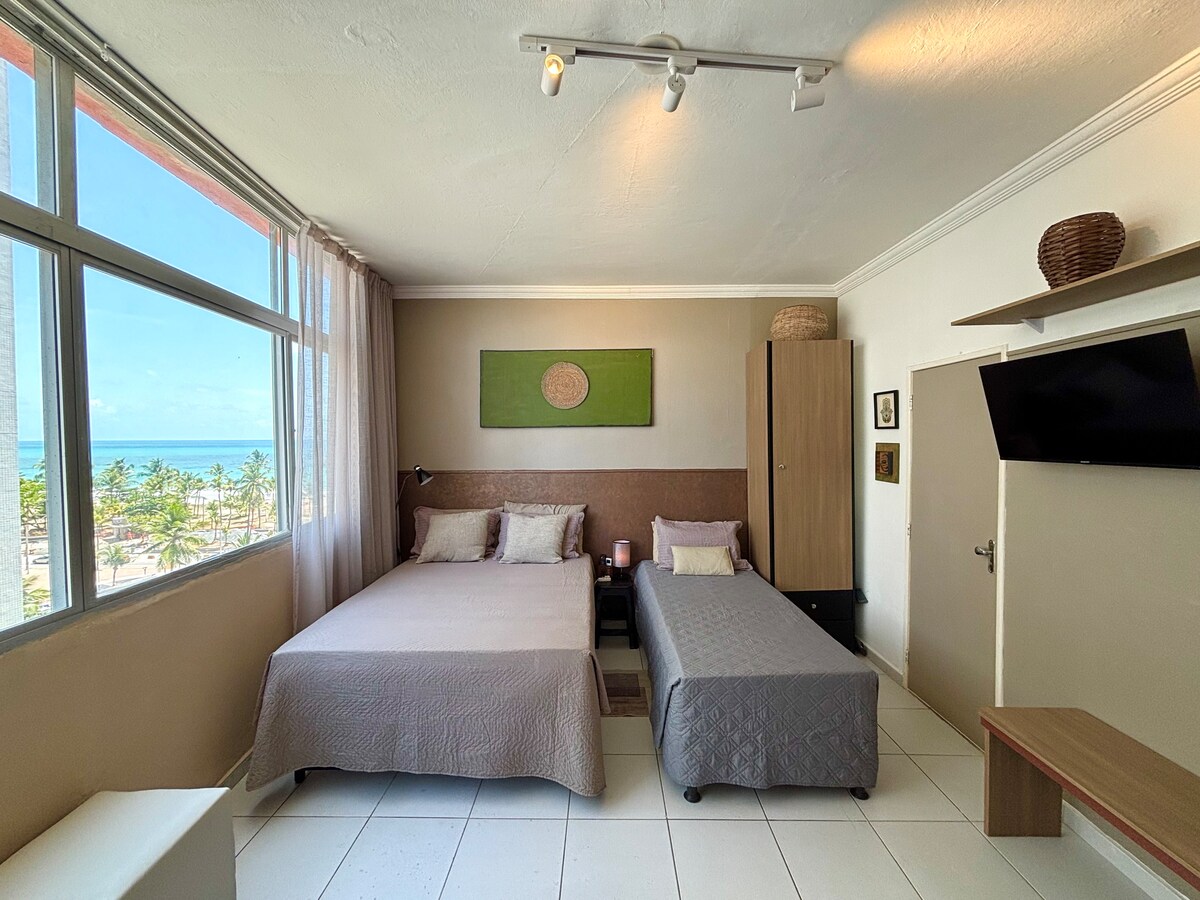 Studija ar skatu uz jūru, 15 minūšu attālumā no lidostas un vecā Resifi un Kongresu centra. Vecā un tradicionālā ēka populārākajā un drošākajā vietā Boa Viagem pludmalē, ar Seu Tito restorānu, Alphaiate bāru un Borsoi kafejnīcu pirmajā stāvā, 24 stundu veikals un Assaí lielveikals tuvumā. Ideāli piemērots praktiskiem un dinamiskiem cilvēkiem, ar labu iekšējo struktūru, virtuvi, Wi-Fi, Queen izmēra gultu, gaisa kondicionētāju un labu dušu. Trešais viesis tiek izmitināts uz ērta matrača īslaicīgai uzturēšanās laikā.