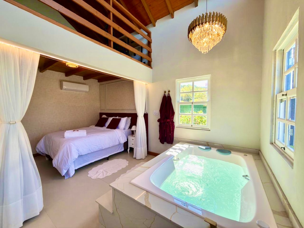 Está suite Master pertence a uma casa de 980metros quadrados, ela tem 120 metros quadrados no total , uma vista deslumbrante e inesquecível, rodeado pela mata atlântica e total vista do mar Paz e conforto em uma cama super king , lençóis e toalhas da trussard , mesa de café da manhã reversível, mini copa com frigobar e utensílios para café da manhã . Tem uma jacuzzi privativa , várias varandas e decks . Agua potável nas torneiras Está é a nossa melhor suite , um lugar encantador e único❤️