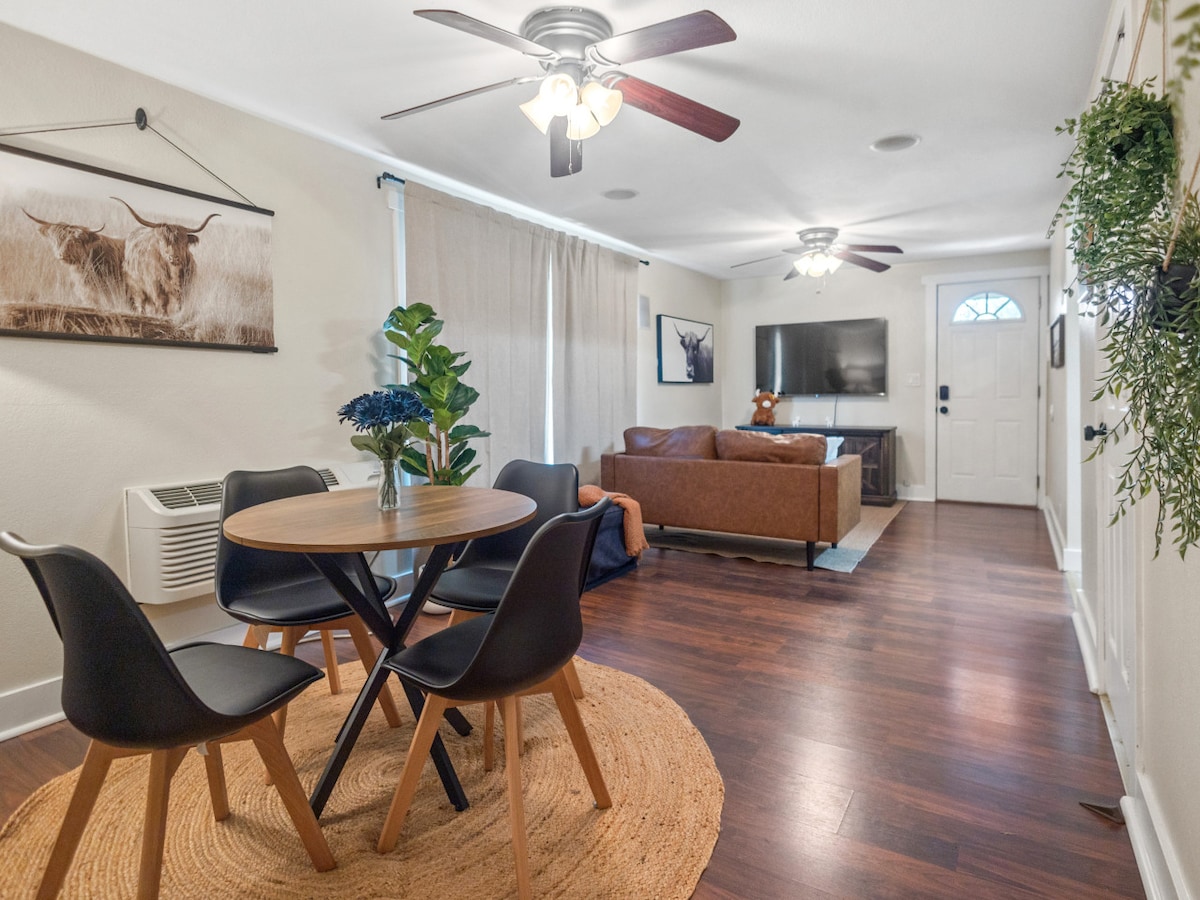 ✨ Atpūta šajā 2BR mājoklī ar privātu pagalma terasi ar grilu un ugunskura vietu. Tā atrodas mierīgā apkaimē un ir ideāli piemērota atpūtai. Izbaudiet filmu vakarus vai galda spēles plašajā viesistabā. Izbaudiet tuvumā esošās ēdināšanas iespējas vai gatavojiet pilnībā aprīkotā virtuvē. Ērti novietots netālu no Gateway Mall, pārtikas veikaliem, vietējiem parkiem, teātriem un restorāniem, jūs atradīsieties tikai 15 minūšu attālumā no memoriālā stadiona un pilsētas centra. Izbaudiet komfortu un ērtības atpūtas braucienā! ✨