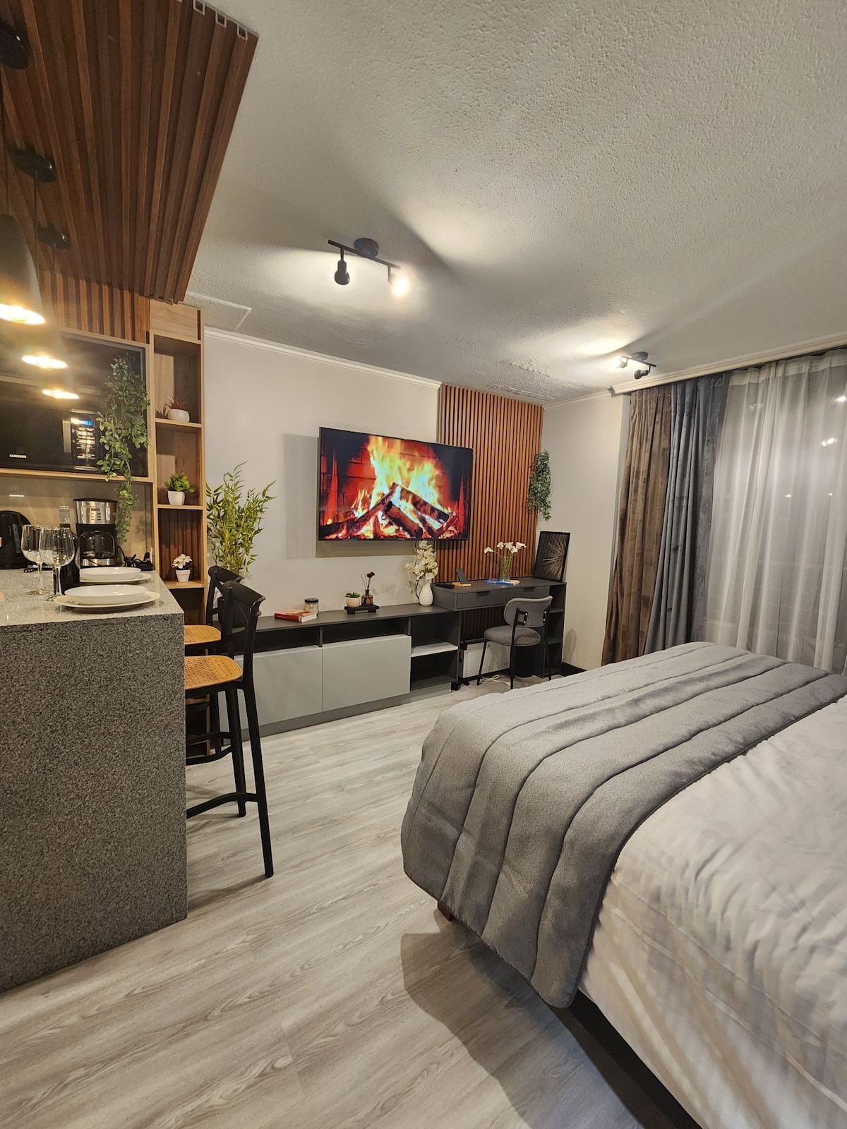 Cozily designed and functional, this 37 m² studio offers a unique open-plan space with 1 bedroom featuring a King-size bed and closet, 1 fully equipped kitchen, 1 full bathroom, 1 living area, Smart TV, Wi-Fi, and 1 parking space. Daily housekeeping and a 24-hour front desk are included, just like a hotel. You’ll have access to shared spaces such as a gym, coworking area, restaurant and panoramic rooftop. Located in El Golf, just steps from the metro, restaurants, shops, and business centers.