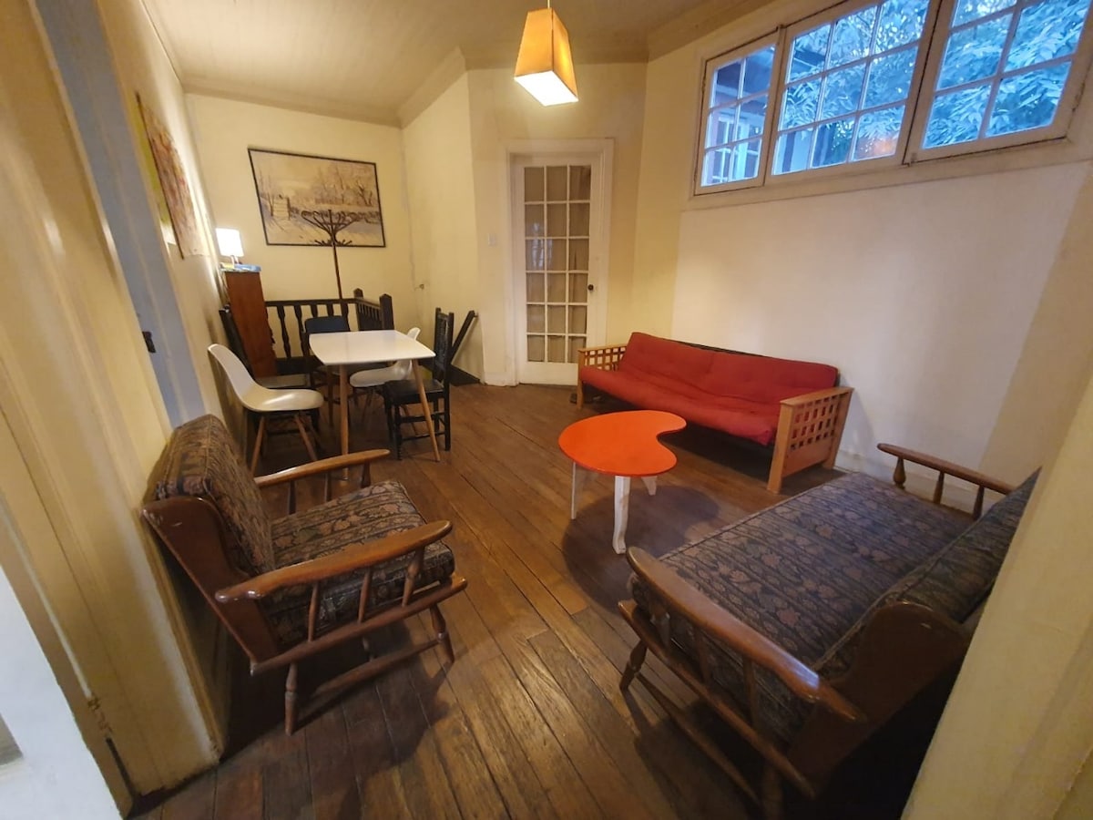 Izbaudiet šīs klusās naktsmītnes skaistumu tikai dažu soļu attālumā no Plaza Ñuñoa un puskvartāla attālumā no metro (L3) Tradicionālā komūnas mājā jūs atradīsiet šo kluso stūrīti ar skaistu koplietošanas terasi. Tā sastāv no guļamistabas, viesistabas ar aprīkotu virtuvi un vannasistabas. Mājā ir viss nepieciešamais ērtai un patīkamai atpūtai. Tas atrodas skaistā dārzā, kas piešķir tam daudz dabiskā apgaismojuma.