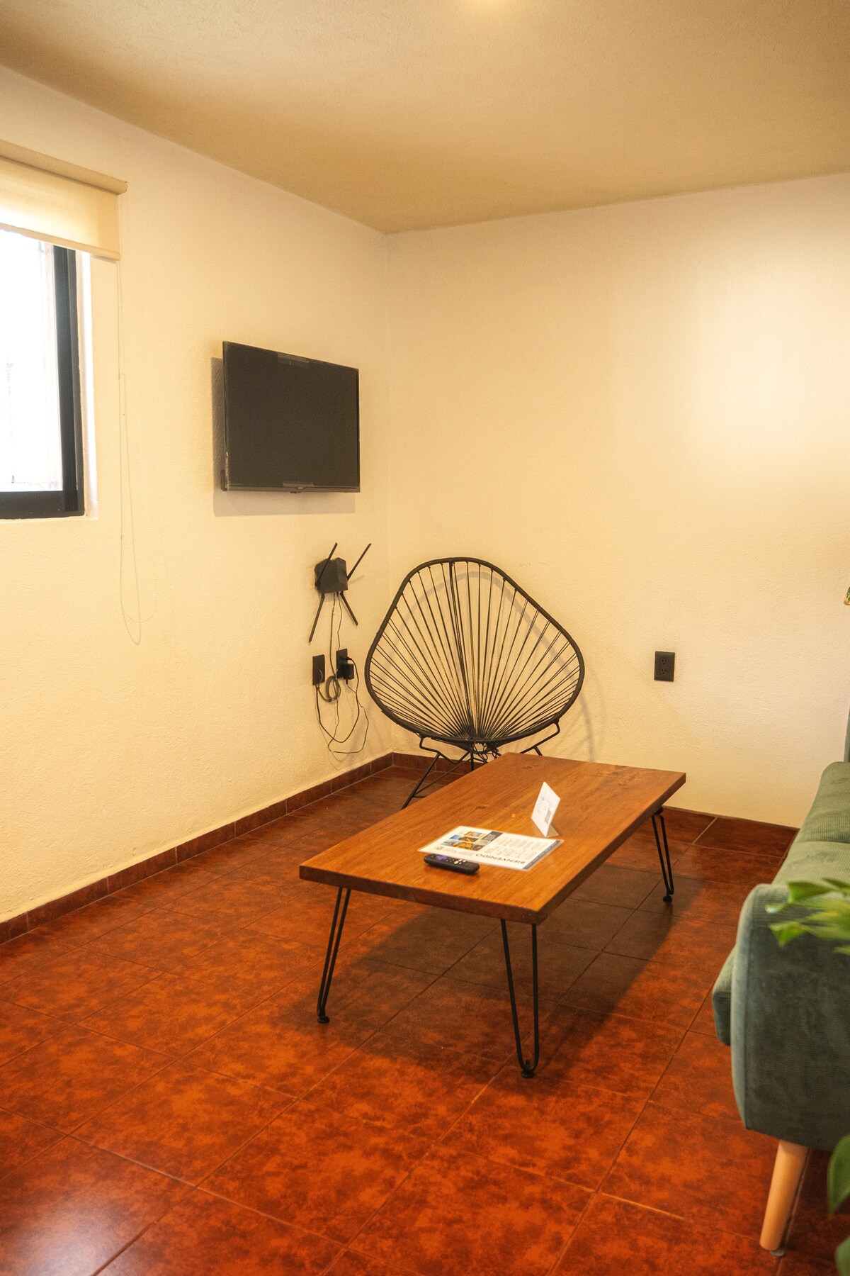 Fantástico estudio con muebles artesanales de alta calidad y un colchón de calidad hotelera. Acomoda hasta 4 huéspedes, ya que el sofá se convierte en cama para dos adultos. Las puertas francesas se abren a un balcón privado con luz natural. A poca distancia de tiendas locales y del lago de Aljojuca (10–15 minutos). A 19 minutos de Ciudad Serdán, con tiendas, restaurantes y central de autobuses, y a 35 minutos del Parque Volcánico. Ideal para conocer la zona o visitar a familiares y amigos.