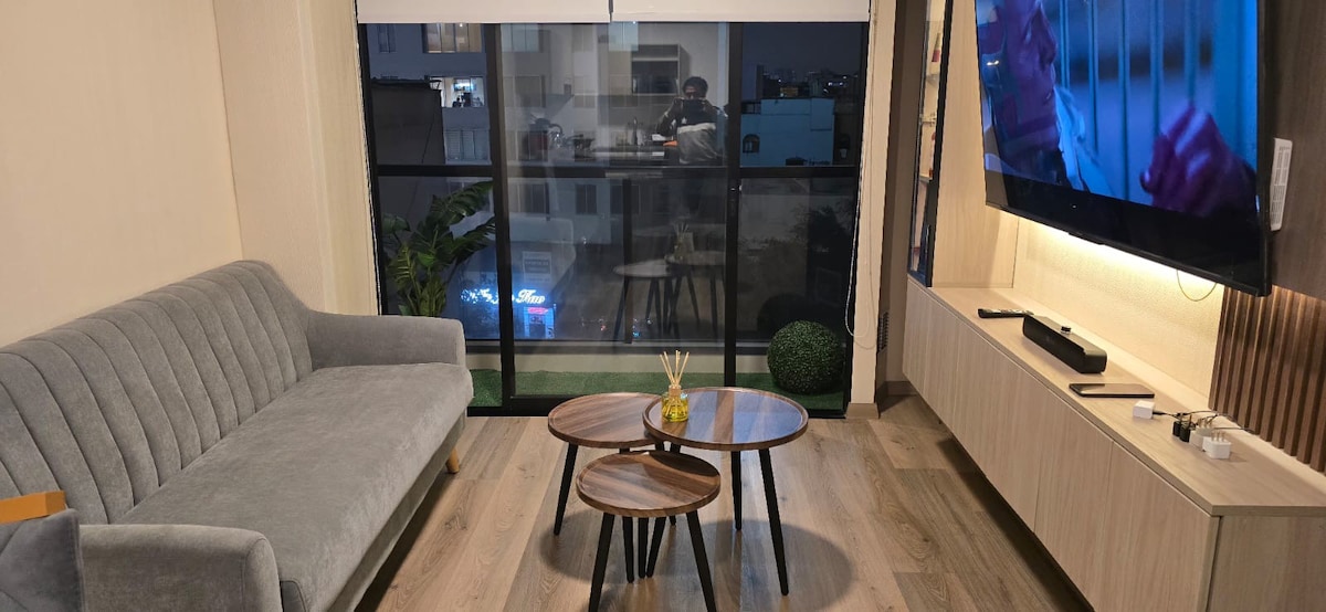 Pilnībā aprīkots pirmizrādes dzīvoklis, kas atrodas stratēģiski svarīgā galvenajā avēnijā Limā, Peru. Ar koplietošanas telpām ēkā, lai padarītu jūsu uzturēšanos unikālu. Tā ir radīta ar nolūku piedāvāt viesiem siltas un viesmīlīgas telpas, kā arī izcilus panorāmas skatus, kas ļaus izbaudīt saulrietus un pilsētas skaistumu.