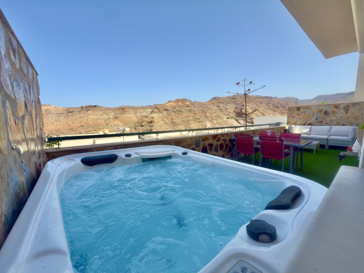 Šim unikālajam mājoklim ir savs stils. Tikko pārbūvēts viss stāvs ar privātu apsildāmu baseinu un panorāmas skatu uz okeānu, golfa laukumu un kalniem. Tajā ir 3 guļamistabas, 2 vannasistabas un plaša dzīvojamā istaba ar jaunu pilnībā aprīkotu virtuvi. Divas lielas terases jūsu priekam. Atrodas jaukā, mazā Tauro ciematā blakus Anfi Golf, pludmalēm Amadores un Tauro, 2 minūšu attālumā no Puertoriko lielās iepirkšanās un naktsdzīves.