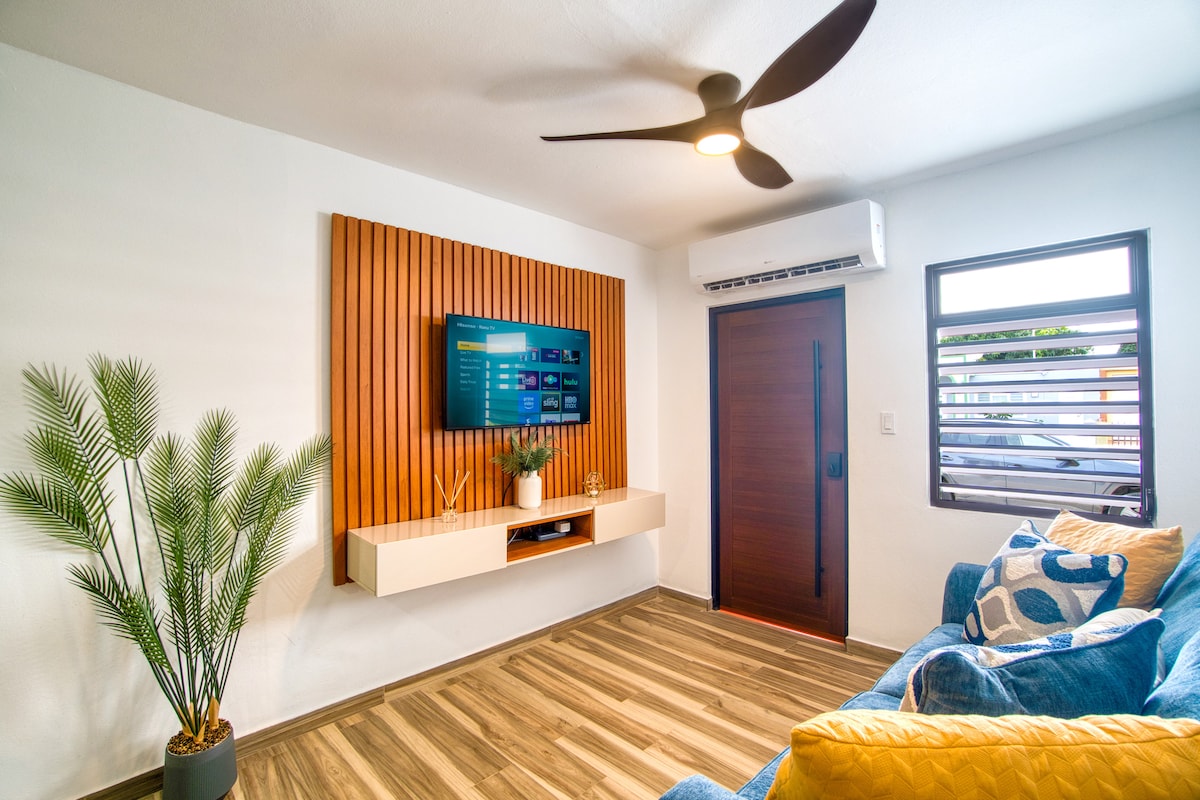 Suite ejecutiva: 3 min playa, elegancia, A/C