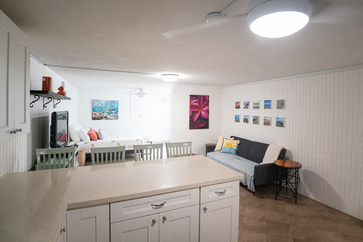 New 18,000 BTU Window AC is now in the living room! Aloha 🏝 Welcome to my recently refreshed (new walk in shower and new tile floors) one bedroom condo located on the beautiful beach in Punaluu (Hauula, Hawaii). There is a lanai with a partial ocean view where you can have a meal or cocktail and relax The kitchen is open concept with a nice counter area for meals & is convenient/comfortable for working from a distance. There is some ocean equipment available to use (boogie boards, fins, etc).