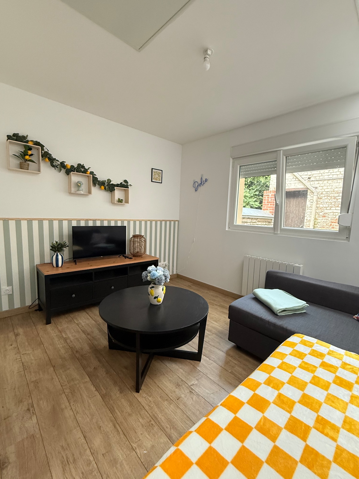 Heure d’arrivée adaptable Appartement de 50 m2 situé dans un petit village aux portes de l’avesnois, jenlain. Sur l’axe valenciennes/ maubeuge. L’appartement est au cœur du village, vous accéderez à toutes les commodités à pied: boulangerie, boucherie, restaurants, primeur. Pour accéder au logement, il faudra monter un escalier L’appartement comprend: une chambre, une salle à manger équipé d’un canapé convertible, une cuisine équipée: lave vaisselle, four, micro onde, réfrigérateur.