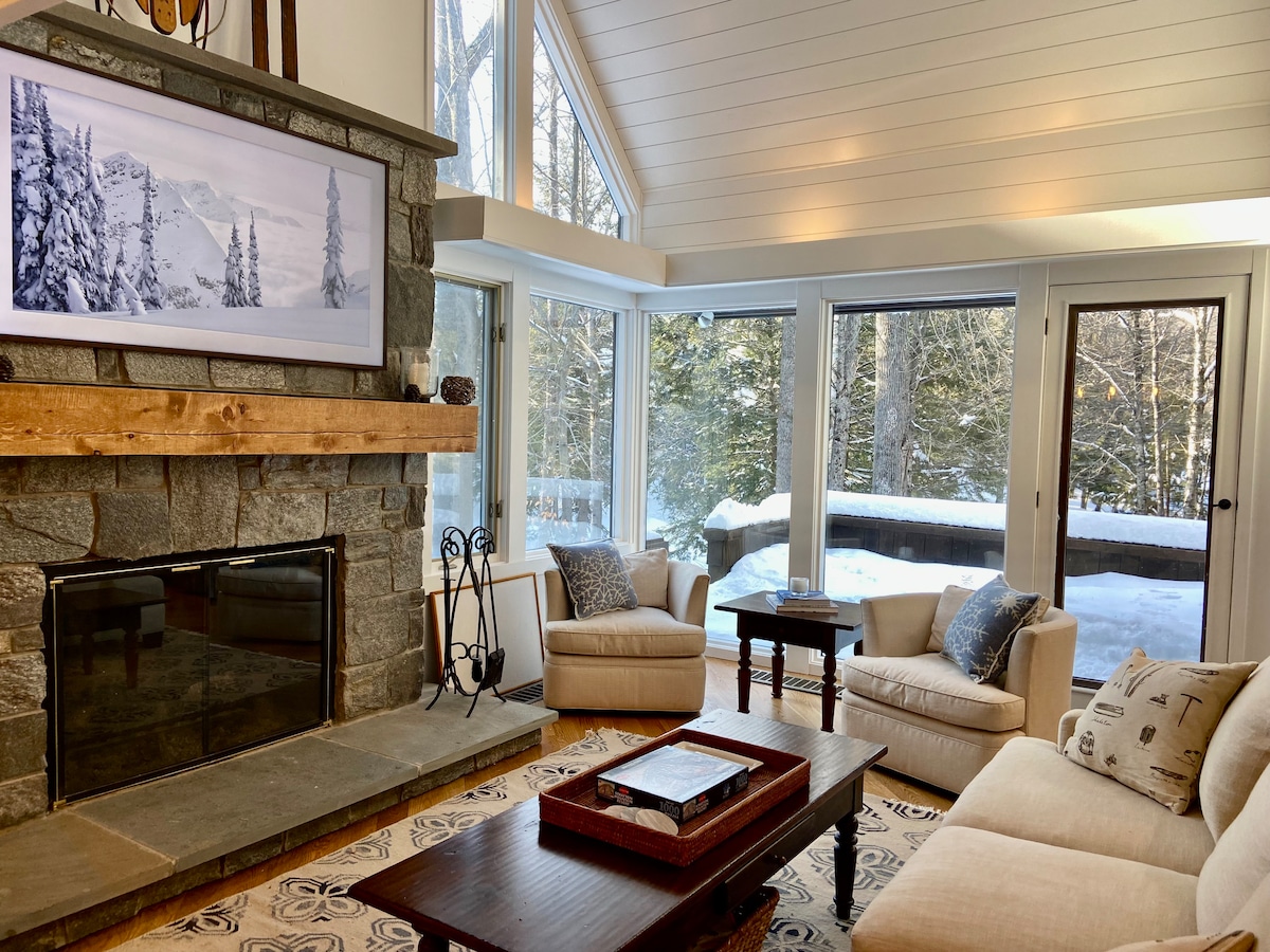 Nāciet atpūsties mūsu mājīgajā atpūtā pēc slēpošanas vai golfa dienas. 36 sarežģīti caurumi vai ieeja/izkāpšana no jūsu durvīm. Šis atvērtā tipa mājoklis ar skatu uz kalniem, velvētiem griestiem, milzīgiem guļamistabas bēniņiem un kamīnu - tas ir lielisks veids, kā aizbēgt pāriem/ģimenēm. Spēcīgs Wi-Fi un īpašas biroja telpas atvieglo darbu attālināti. 4 viedie televizori un daudz spēļu/rotaļlietu atpūtai arī mājās! Turklāt mūsu viesiem ir piekļuve visām Quechee Resort papildērtībām, piemēram, sporta zālei/saunai/baseiniem/pludmalei/raket/ēdamistabai un citām...