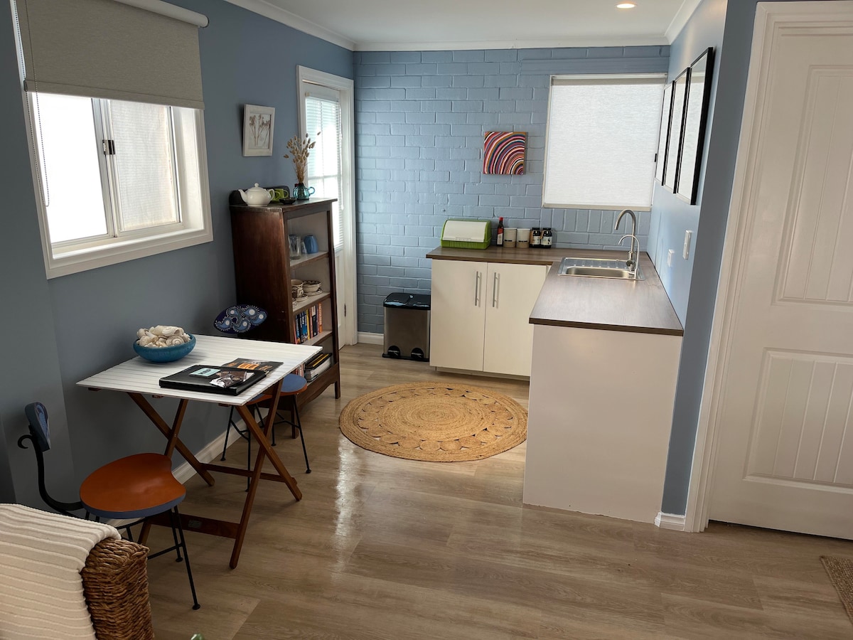 Svaiga un moderna piekrastes iedvesmota telpa ar lielu galveno guļamistabu - 2 pastaigas ar halātiem - vannasistabu un tualeti ar savu privāto atpūtas zonu. Wi-Fi - liels televizors - Netflix - Bāra ledusskapis - Mikroviļņu krāsns - Tosteris - Tējkanna un ēdamistabas pamataprīkojums. Mājas priekšpusē ir lielas aizslēgtas šķūņa durvis, kas atdala jūsu mājokli no pārējās mājas jūsu privātuma dēļ, un tās nav koplietojamas telpas. Svaigi dvieļi - veļa - ūdens pudelēs - piegādāta tēja un kafija. Privāta piekļuve durvīm.
