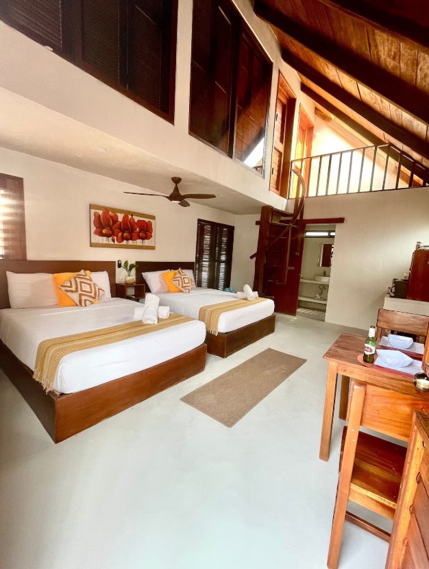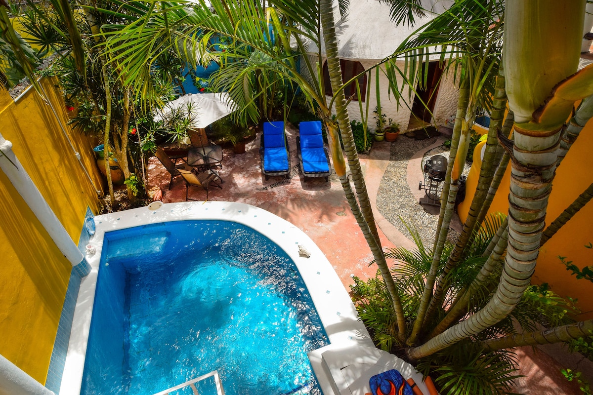 Kozumeliešu dizaina 2 stāvu Casa ar King izmēra gultu, gaisa kondicionētāju/ventilatoriem abos līmeņos. Apaļas kāpnes ved uz lielu privātu tualeti ar ieeju dušā un vannā. Augšstāvā ir divvietīgs dīvāns un skaisti iebūvēti skapji. Pilnībā aprīkota virtuve galvenajā stāvā atveras uz viesistabu-ēdamistabu un papildu divdaļīgu vannasistabu. Ārā jūs gaida baseins, dīķis un sulīgi dārzi ar galdu/krēsliem un zviļņiem. Palapa ar sēdvietām, ventilatoru/naktslampām atrodas virs baseina telpas pāri pagalmam.