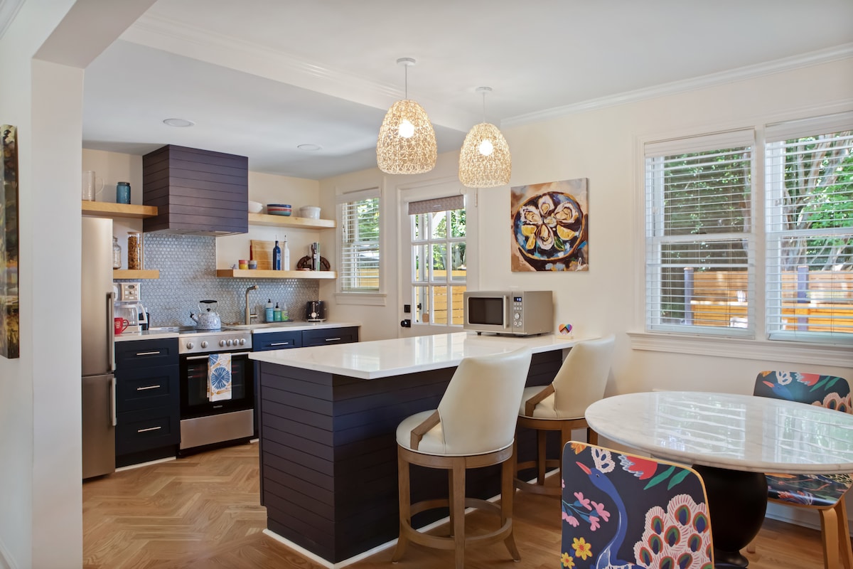 Nepilnas jūdzes attālumā no Raleigh centra šī pied-à-terre ir gaumīgi iekārtota. Pilna virtuve, veļas mazgājamā mašīna/žāvētājs, daudz dabiskā apgaismojuma, divi televizori, piebraucamais ceļš un terase ar strūklaku un skatu uz dārzu. Nesen izremontēta vannasistaba un svaigi krāsota āriene. Dodieties ar Uber uz pilsētas centru un izpētiet muzejus, restorānus un nakts dzīvi. Bezmaksas kafija un espresso. Ikmēneša+ mājokļi ietver bezmaksas uzkopšanu reizi divās nedēļās.