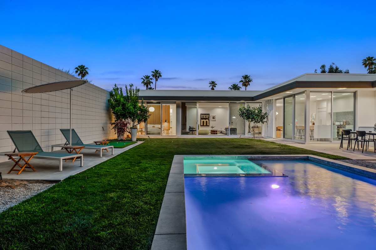 Palmetto māja - luksusa + gadsimta vidus oāze ar privātu kūrortam līdzīgu baseinu ar kabanu, ugunskura vietu, burbuļvannu un brīnišķīgiem skatiem uz San Jacinto kalniem, kas atrodas aptuveni 2 jūdžu attālumā no Palmspringsas centra. Šo gadsimta vidus moderno mājokli projektēja leģendārais arhitekts Džeimss Cioffi, un tas piedāvā plašu plānojumu un nevainojamu plūsmu uz baseina zonu. Augsti griesti un logi ļauj plūst tonnām dabiskā apgaismojuma, radot oāzi gan iekšpusē, gan ārpusē.