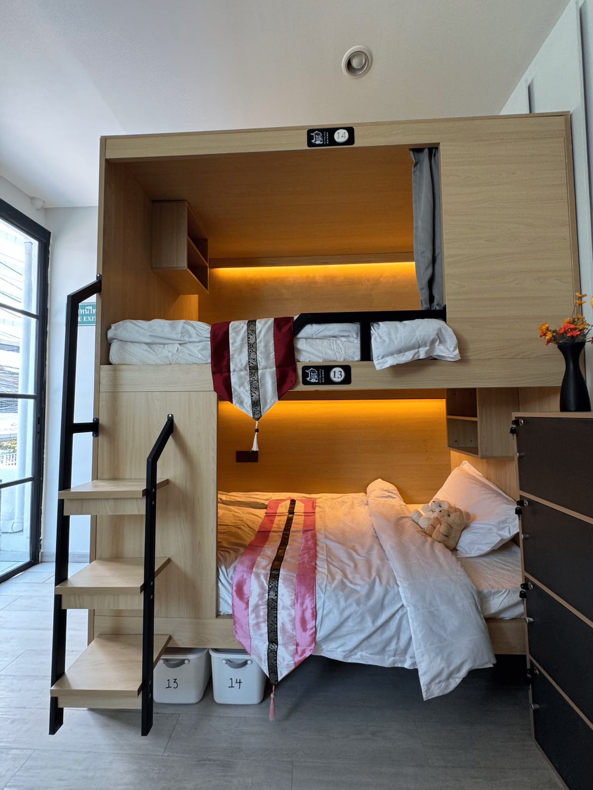 Mājīga 4 personu istaba tikai 2 minūšu attālumā no MRT Samyan – ideāli piemērota ģimenēm un draugiem. Ir četras ērtas divstāvīgas gultas, privāta vannasistaba, pilna izmēra ledusskapis, liela ekrāna televizors un mājīga telpa atpūtai vai filmu skatīšanai. Izbaudiet skatu uz dārzu un 2 rakstāmgaldus plānošanai vai žurnāla rakstīšanai. Plašs, tīrs un pilnībā aprīkots ērtai uzturēšanās vietai. Ātrs Wi-Fi un pašreģistrēšanās padara visu vienkāršu un bez stresa