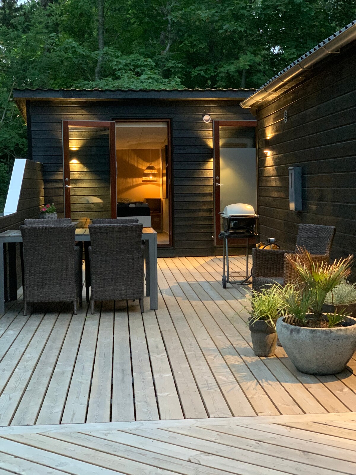 Here you will find peace, relaxation and plenty of fresh air. The house is located in the countryside with beautiful nature, which invites you to both walks and quiet moments with a good book. If the family also includes a dog, then there is plenty of space for all of you. The house is surrounded by a large garden and lawn, as well as terraces on several sides. In the forest near the house we have built a shelter. The shelter can be used for a short break or an overnight stay in the nature.