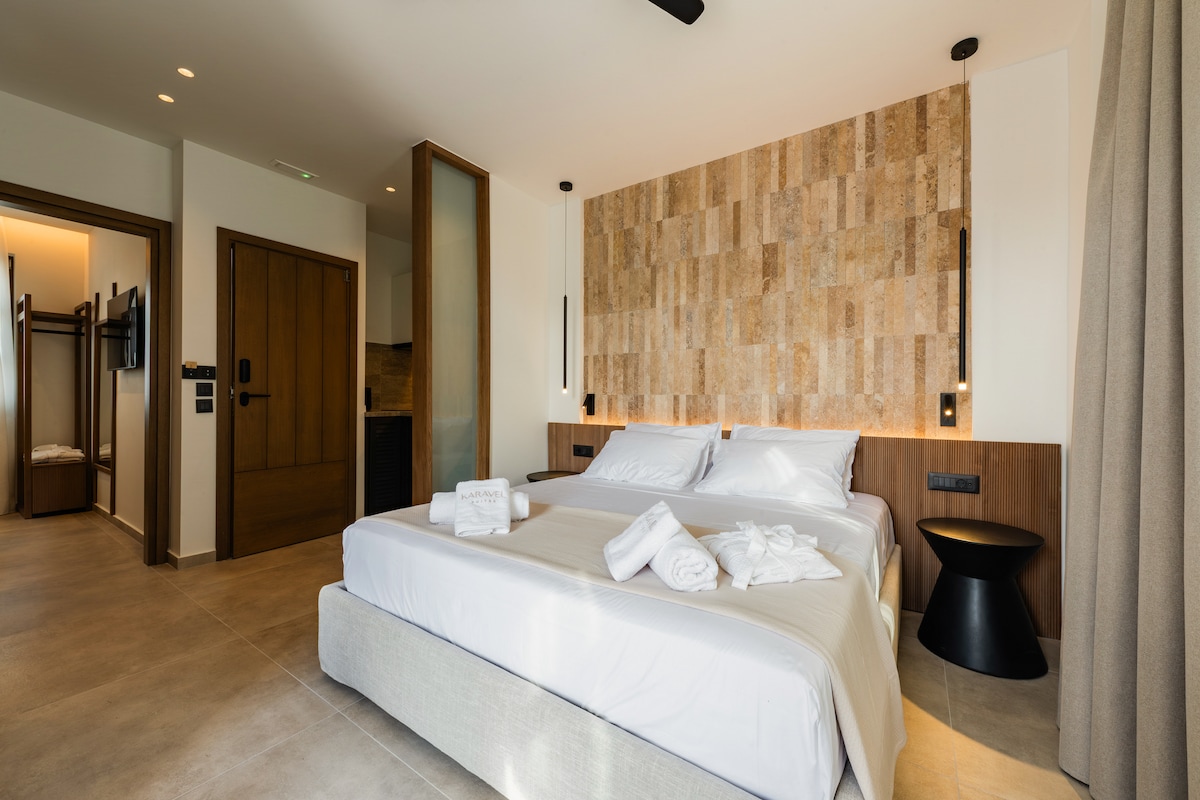 Gultas un matrači, ko COCO-MAT® izgatavo tikai no 100% dabīgiem materiāliem. Šajā numurā ir divguļamā gulta (Queen), mini bārs un vannasistaba ar dušu. Visas istabas ir aprīkotas ar papildērtībām ar 100% dabiskiem materiāliem no Grieķijas zemes un olīveļļu, ko piedāvā O.Live®. Gulta: 1 divguļamā gulta (Queen) Istabas platība: 18 m2
