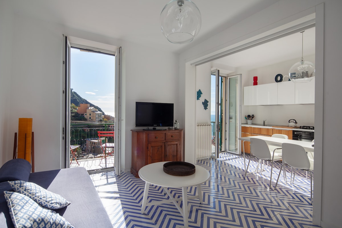 Augstākā stāva dzīvoklis ar lielu terasi ar skatu uz jūru brīvdabas vakariņām ar skatu uz saulrietu, 200 metru attālumā no jūras, klusā centrālajā zonā, slēgta satiksmei. 100 kvm, 2 guļamistabas , dzīvojamā istaba un virtuve, vannasistaba ar dušu. Dažu minūšu attālumā no stacijas , ēka, kas atrodas raksturīgajos Ligūrijas vagonos. Portofino atrodas 1 stundas brauciena attālumā , Portovenere un pārējās piecas zemes ir sasniedzamas ar prāmi , kura pietura atrodas dažu minūšu attālumā no dzīvokļa.