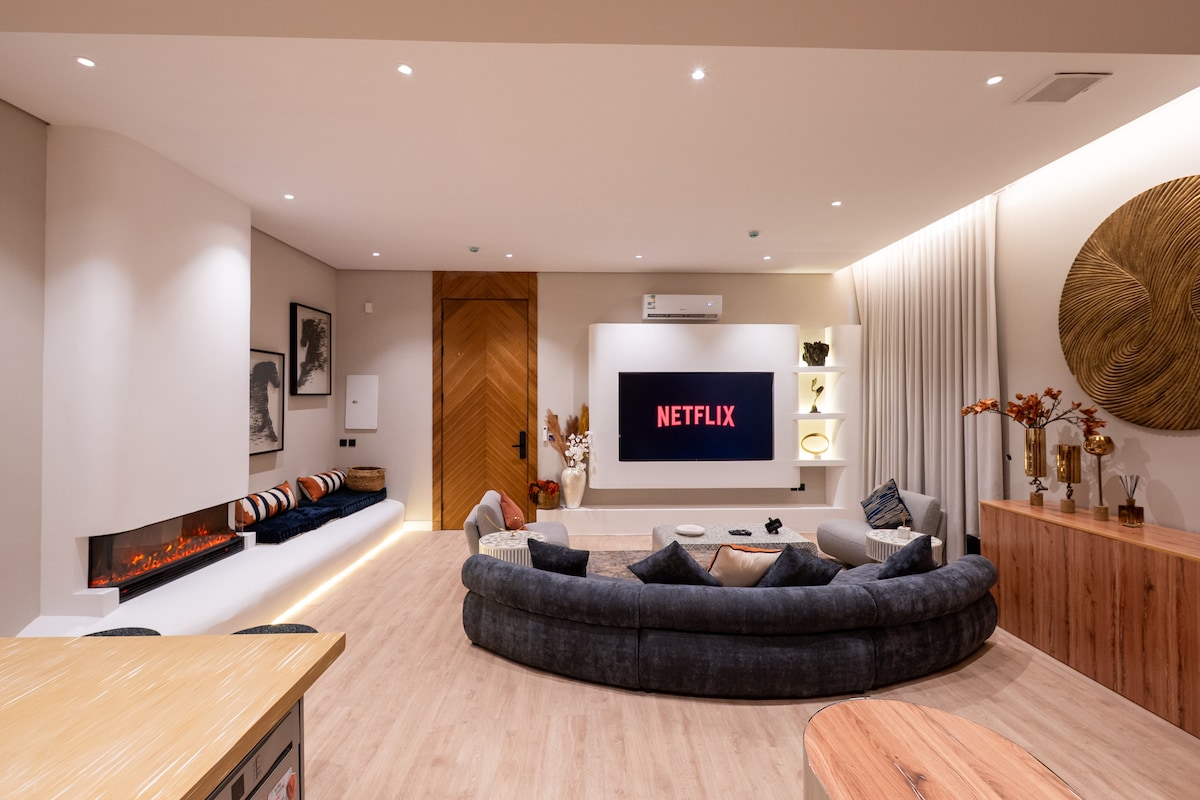 Luksusa divistabu dzīvoklis ar privātu džakuzi uz jumta Al Malqa rajonā, Riādas ziemeļos. Izbaudiet stilīgu uzturēšanos ar 75 collu QLED viedo televizoru, kurā pieejami Netflix, Disney+, Shahid un OSN. No jumta paveras skaists skats, tur ir āra sēdvietas un atvēsinoša miglas sistēma, kas rada atsvaidzinošu atmosfēru. Ātrgaitas optiskais Wi-Fi, kafijas automāts, elektriskā cepeškrāsns un pašreģistrēšanās. Ideāli piemērots pāriem un mierīgiem vakariem uz jumta.