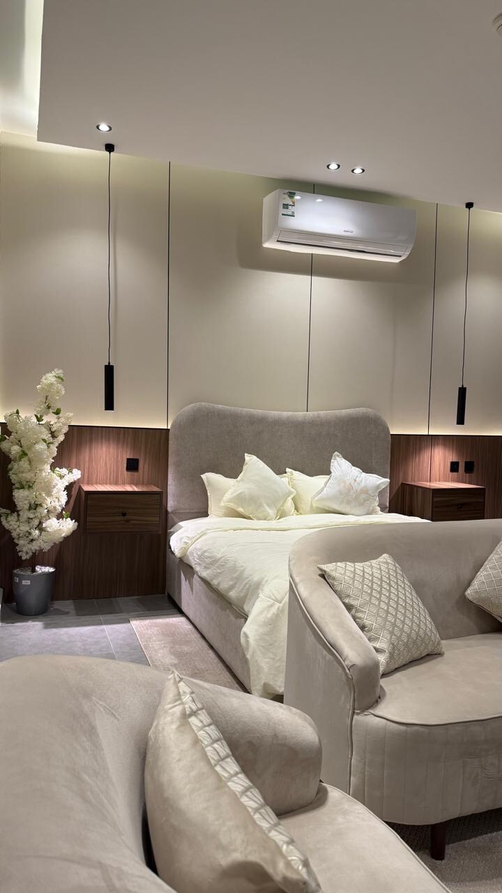 استديو بتصميم عصري أنيق يجمع بين الهدوء والفخامة، حيث تتناغم الألوان الحيادية مع الإضاءة المخفية في السقف لتخلق أجواء دافئة ومريحة. تمنح الأرضية الخشبية المكان طابعًا منزليًا راقيًا، بينما يضيف السرير الأبيض وشكله المرتّب إحساسًا بالنقاء والراحة. منطقة الجلوس مزوّدة بأريكة مريحة ووسائد ناعمة بدرجات هادئة، تلفاز جداري كبير يعرض مشهدًا طبيعيًا، المكان مصمم بعناية ليكون ملاذًا هادئًا، عمليًا، وأنيقًا مناسب لمن يبحث عن سكن مريح بلمسة فاخرة وخصوصية عالية