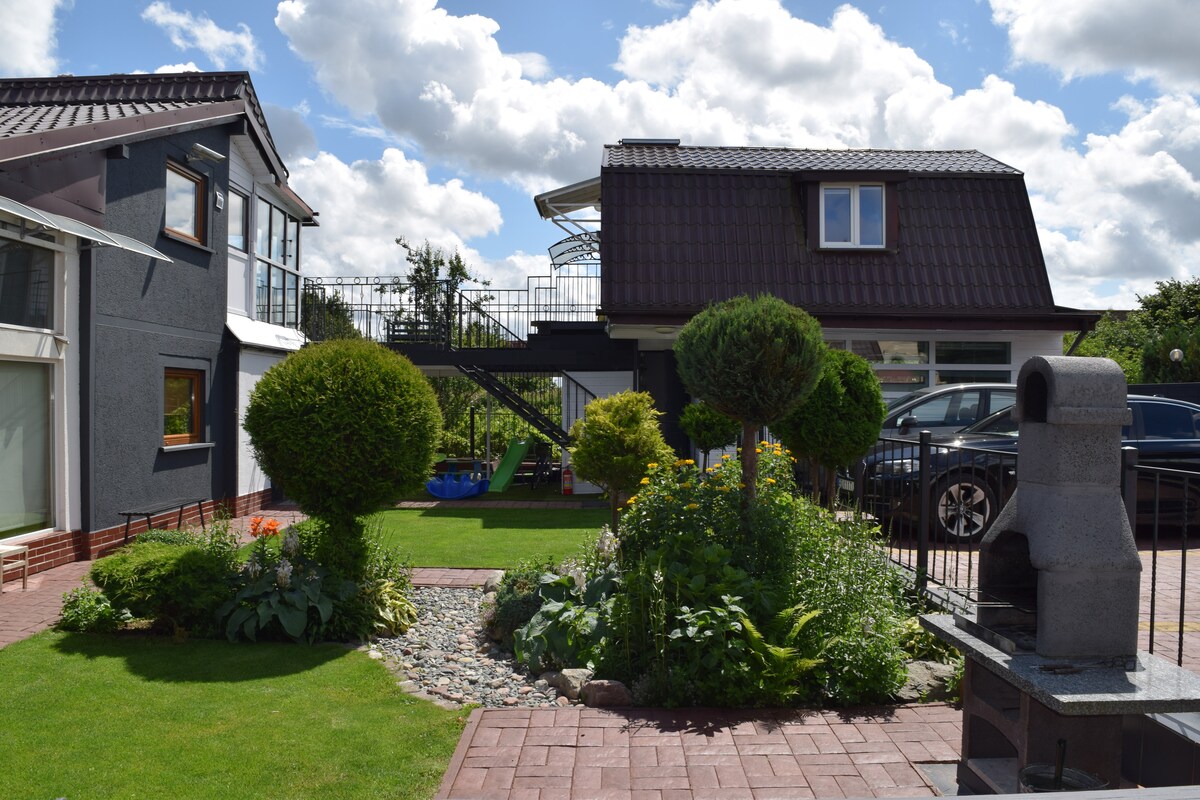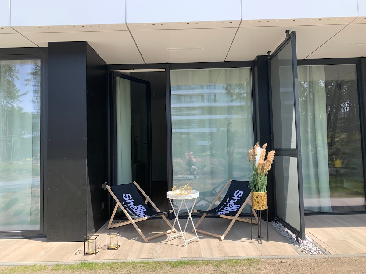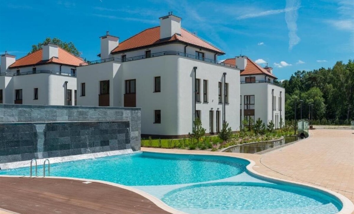 Apartament z ogródkiem, pomiędzy morzem a jeziorem, w sercu rezerwatu przyrody i sosnowego lasu, 3 min spacerem do plaży. Do dyspozycji gości prywatny, zadaszony i przestronny taras, salon z w pełni wyposażonym aneksem kuchennym, sypialnia, łazienka, garaż podziemny i rowerownia. Duże okna pozwalają naturze wnikać do wnętrza apartamentu, dzięki czemu cały czas obcujesz z przyrodą. Na terenie osiedla - saunarium, baseny, jaccuzii, siłownia i strefa spa (za opłatą).