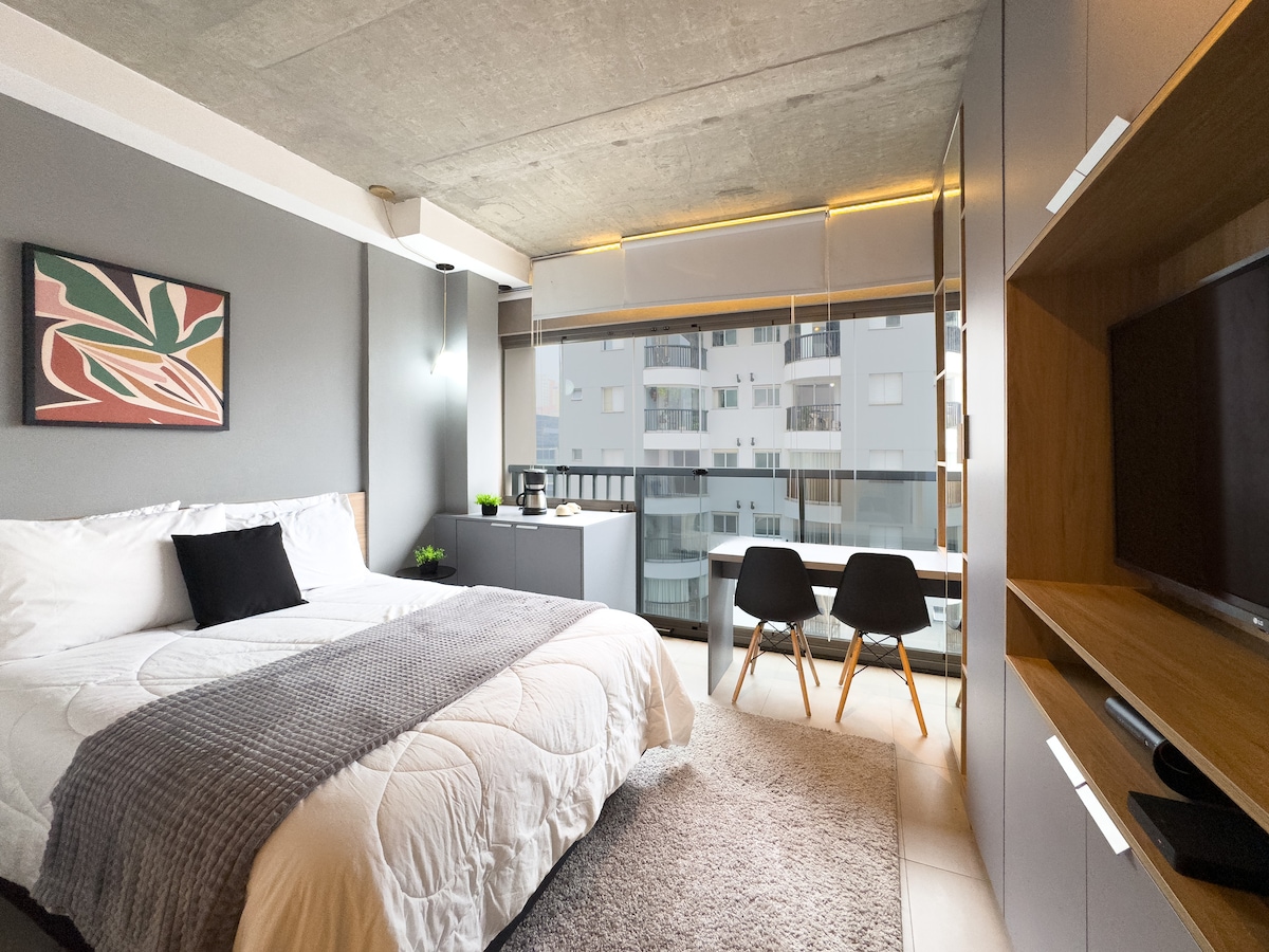 Studija netālu no Pq Ibirapuera ar modernu dekoru, iebūvētu LED apgaismojumu, kas nodrošina komfortu un labsajūtu. Durvis ar elektronisko slēdzeni, gaisa kondicionētāju, aizkariem ar aptumšojumu. Diennakts vārti Neliela, koku ieskauta iela Wi-Fi, peldbaseins, sauna, sporta zāle, velosipēdu statīvs Atsevišķs krāns ar filtrētu ūdeni Matracis (pāris) Simmons ar kastes lādi Darba krēsls Herman Miller Viedtelevīzija Samsung 65" Nespresso Citz Cooktop Cafeteria mikroviļņu krāsns veļasmašīna un žāvētājs