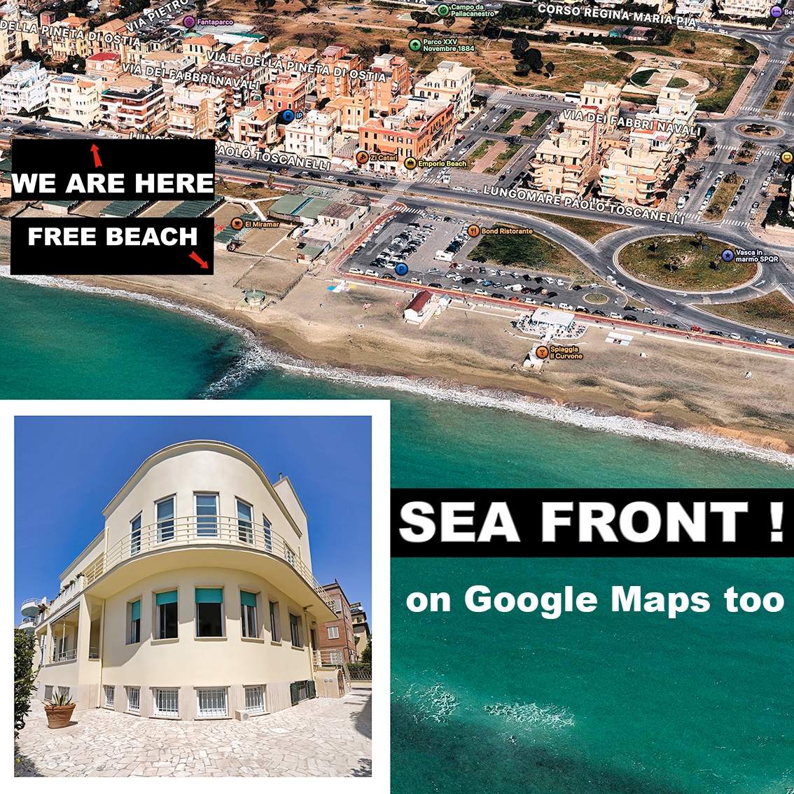 Splendido appartamento fronte mare con affaccio su piazza delle Caravelle e sul lungomare. Dista 50mt dall’accesso in spiaggia. Completamente ristrutturato in una palazzina d'epoca in cortina anni 40. Composto da salone con divano letto matrimoniale, camera da letto, cucina completamente attrezzata e bagno con doccia. Ben collegato, 10 min a piedi dalla stazione Lido Centro dalla quale si raggiunge Roma centro. Dotato di ogni confort, climatizzatore e riscaldamento, Wi-Fi, TV, lavasciuga.