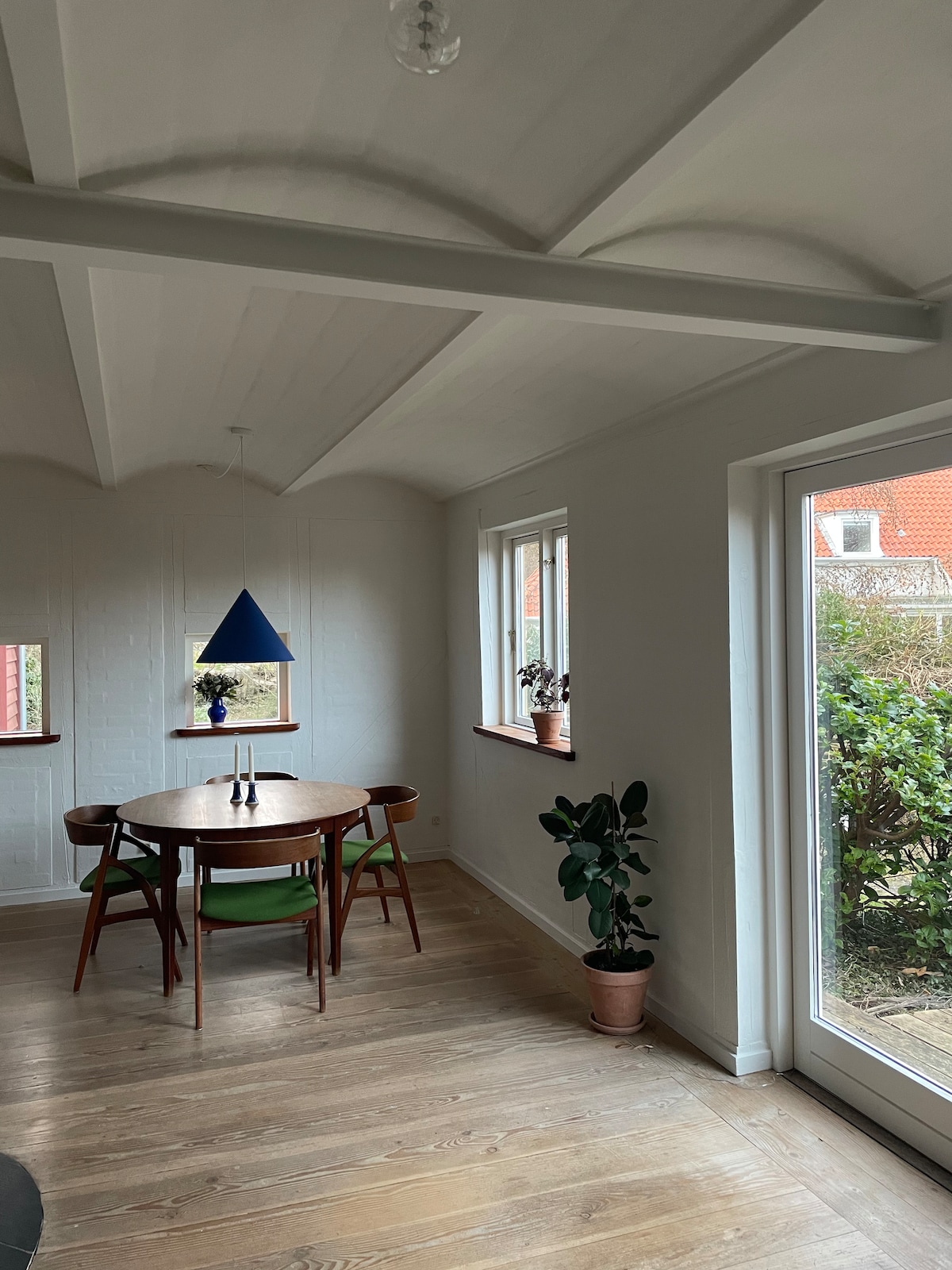 Gudhjemā ir ļoti maz īstu vasarnīcu. Lūk, viens - unikāls - gan stilā, gan atrašanās vietā. Ziemeļu/bohēmiskā noskaņa tiek rūpīgi īstenota visā mājā. Viss no guļamistabas ar pitoresku skatu augšstāvā uz virtuvi/dzīvojamās istabas zonu ar kamīnu un franču durvīm, kas ved uz romantisko mazo pagalmu, kas sadalīts sīkās terasēs dažādos līmeņos, līdz atpūtas zonai ar gāzes grilu starp klematisu uz apkārtējā akmens žoga, vienkārši kliedz uz hygge !