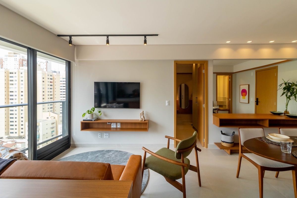 ❗️Unikāls, elegants un izsmalcināts jaunais daudzdzīvokļu nams🤩, kas radīts, lai jūs varētu justies kā mājās. Noskatieties savu iecienītāko filmu guļamistabā vai viesistabā modernākajā viedajā televizorā ar gaisa kondicionētāju, ēdamgaldu un īpašu darba vietu. Atpūtieties labākajā gultā, izbaudiet gardāko dušu, baudiet balkonu un skaistu saulrietu ar skatu uz parku un izbaudiet mūsdienu Setor Bueno labāko Goiânia reģionā! Condomínio Tai Residências