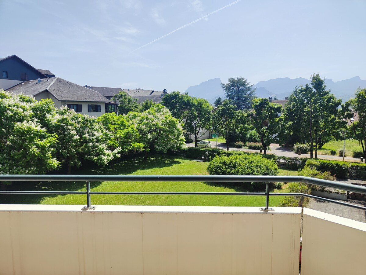 Ce logement familial calme est proche de toutes commodités : bus, supermarchés (carrefour, l'eau vive (AB), décathlon etc.) A 10 minutes en vélo du centre ville, 20 minutes du lac du Bourget. L'appartement est situé au 2ème étage de notre maison; c'est un T3 de 80m2 sous pente, avec une cuisine - salon, 2 chambres. Vous disposez d'une coquette petite salle de bain avec douche. La terrasse offre une magnifique vue sur la chaîne de Belledonne. Place parking privée dans la propriété.