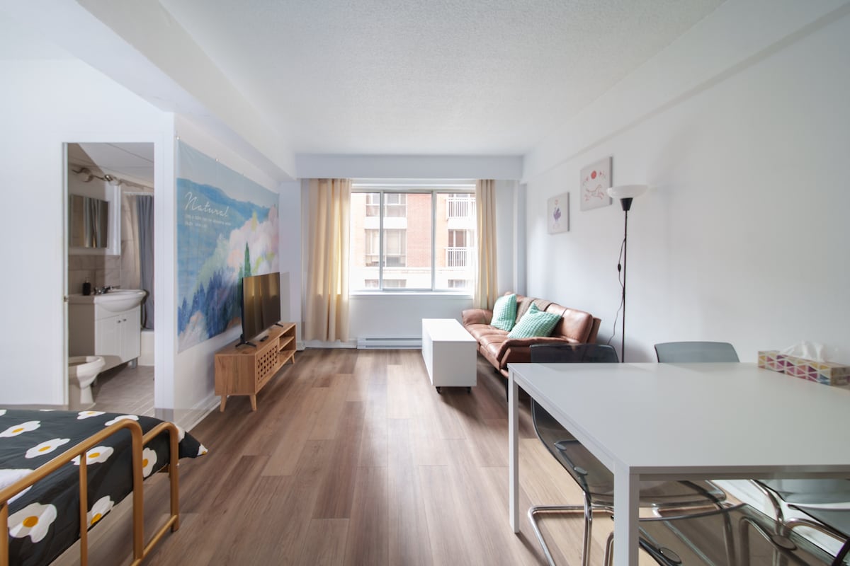Mājīgs privāts dzīvoklis, kas ir pilnībā mēbelēts. Ja jums ir kādas papildu prasības, lūdzu, jautājiet, vai esat mans viesis . Atrodoties pašā Monreālas centrā, tikai 1 minūtes gājiena attālumā no metro un Sv. Katrīnas avēnijas, jūs atradīsiet visas tuvumā esošās papildērtības un aprīkojumu, lielveikalus, restorānus, bārus un frizierus. Šī greznā un ērtā studija ar viesistabas telpu ir gatava uzņemt jūs. Telpās ir arī privāta sporta zāle, iekštelpu peldbaseins un pirts autostāvvieta, kas pieejama kā papildu aprīkojums