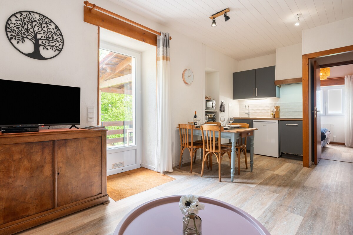 Patīkama naktsmītne Sarlat 47 m2 platībā ar terasi un dārzu , elpu aizraujošiem skatiem, paliekot netālu no Sarlatas centra, kas pieejama ar kājām. Tā atrodas klusā, drošā dzīvesvietā ar peldbaseinu, kas atvērts no 1. jūnija. tas ir aprīkots ar gaisa kondicionētāju, un jūs varat bez maksas uzlādēt elektromobili privātajā autostāvvietā.