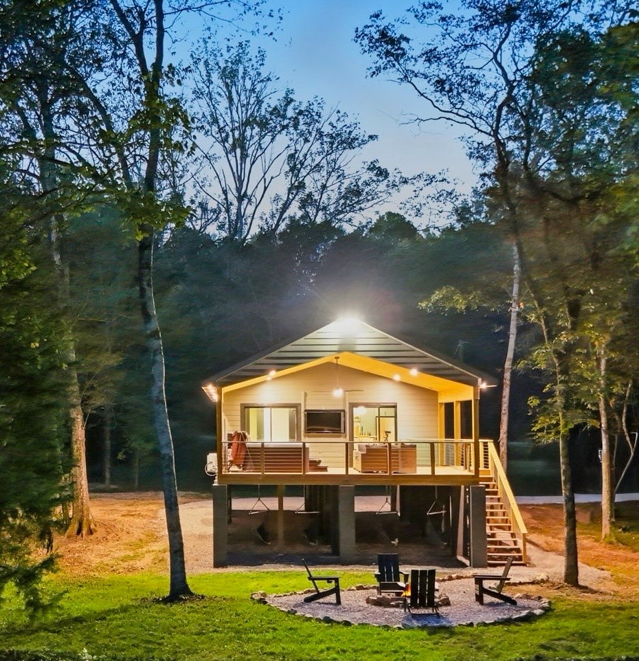 The Cedar Springs Cabin, located on the outskirts of beautiful Hot Springs, Arkansas, is a unique, one-of-a-kind experience. This beautifully crafted structure is rustic, yet modern. Enjoy gorgeous views from the top balcony or relax downstairs on the custom outdoor swinging bed. The property is perfect for a romantic couples getaway but also incredibly family-friendly with the outdoor game area and "buried bus" theater room!