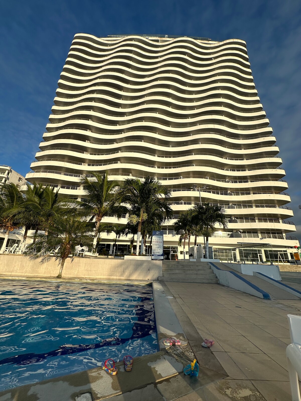 El apartamento está ubicado en el cuarto piso de la Torre II del Resort Playa Azul con instalaciones que garantizan confort y seguridad las 24 horas del día. Con acceso directo a la playa y al mar, dispone de amplias zonas sociales de descanso, hamacas rodeadas de palmeras, amplias piscinas para niños y adultos y 2 hidromasajes, cancha de tenis, juegos de mesa. El departamento es ideal para una pareja con niños. o para trabajar. La suite tiene escritorio y conexión de internet .