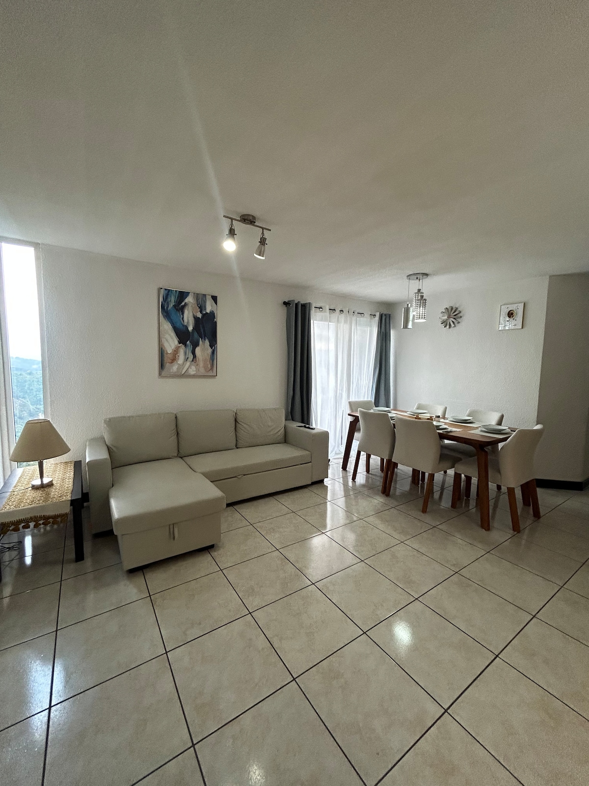 Dentro de un condominio privado tranquilo y muy seguro acceso 24 horas 3 habitaciones 2 estacionamientos con opción a 2 mas 2 baños completos con agua caliente cocina equipada, sala, comedor y desayunador 2 balcones Vistas relajantes a las montañas y bosque desde un nivel 14 silencioso en las noches Ubicado a 5 minutos de Centros Comerciales de 15 a 20 minutos del centro histórico y de Paseo Cayala lugar apto para viajes de turismo y familia Espacio Limpio con ventilación e iluminación natural