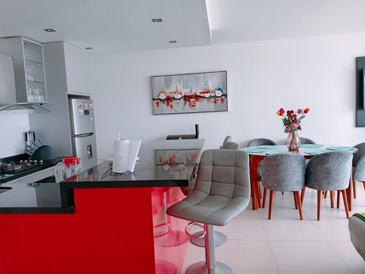 Jauns dzīvoklis ar skatu uz okeānu, 5 kvartālu attālumā no pludmales. Tajā ir 2 baseini , grila zona, futbola laukums, basketbola spēles bērniem un ienākumi cilvēkiem ar invaliditāti. Ja vēlaties svinēt savu dzimšanas dienu , romantisku atpūtu vai būt kopā ar ģimeni. Šis ir jūsu mājoklis, izbaudiet jauno Punta Mar tirdzniecības centru tikai 5 minūšu attālumā un tirdzniecības centru KM 40 ar dažādiem veikaliem, piemēram, Wong un Smart Fit sporta zāli, kā arī dažādus naktsklubus.
