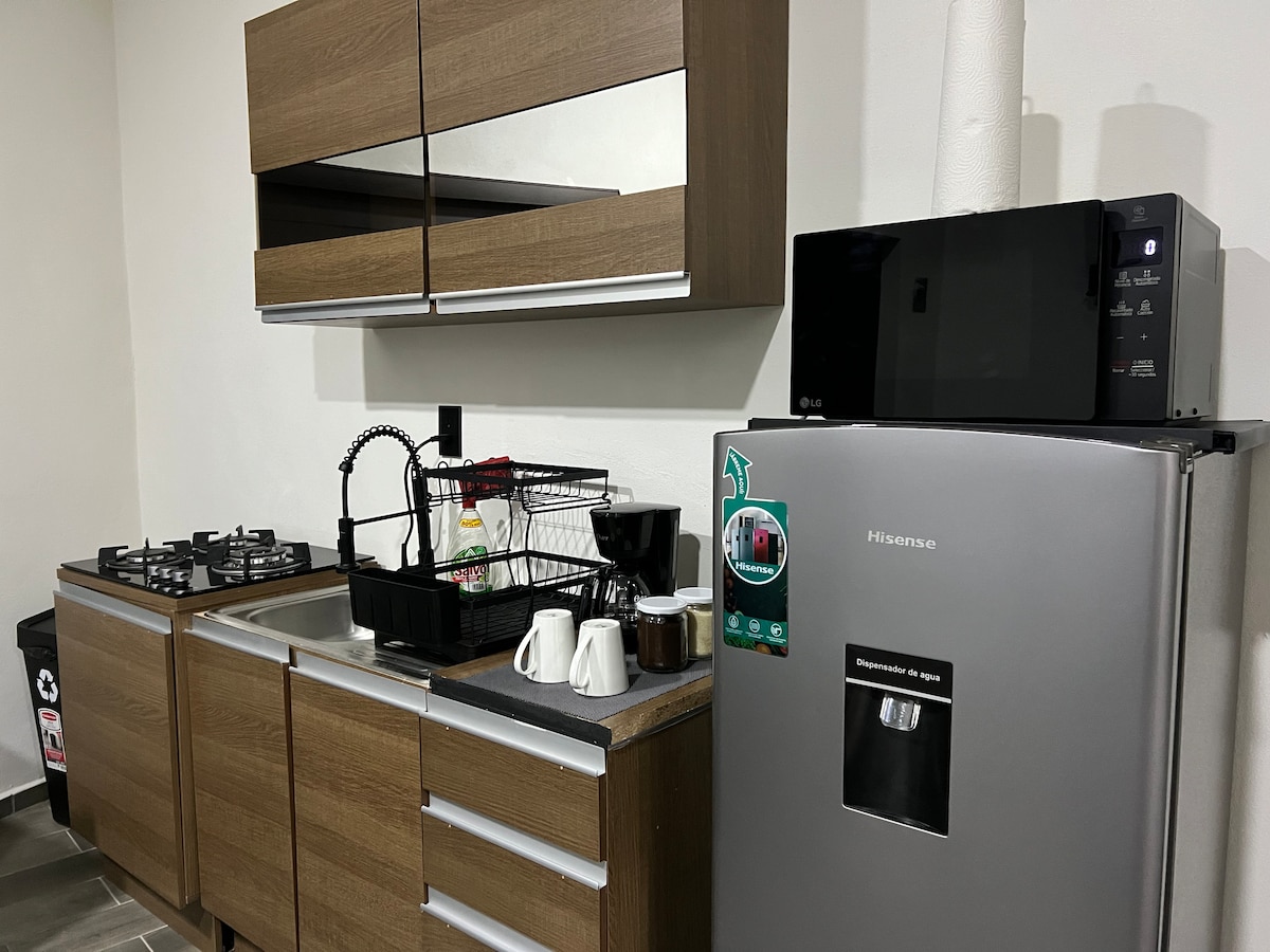 Mājīgs, pilnīgi neatkarīgs studijas tipa dzīvoklis ar viesistabu, ēdamistabu un virtuvi. Lieliski piemērots atpūtai vai darba braucienam. Tikai pāris kvartālu attālumā no Tepic Libra un tikai 8 minūšu attālumā no Tepic ekoloģiskā un tehnoloģiskā parka, 15 minūšu attālumā no Plaza Forum vai 15 minūšu attālumā no vēsturiskā centra. Ļoti klusā, ģimenēm draudzīgā dzīvojamā rajonā. Tajā ir laulāto gulta un dīvāngulta. Viedtelevīzija, Wi-Fi, virtuve ar elektrisko plīti, kafijas automātu un mini ledusskapi.