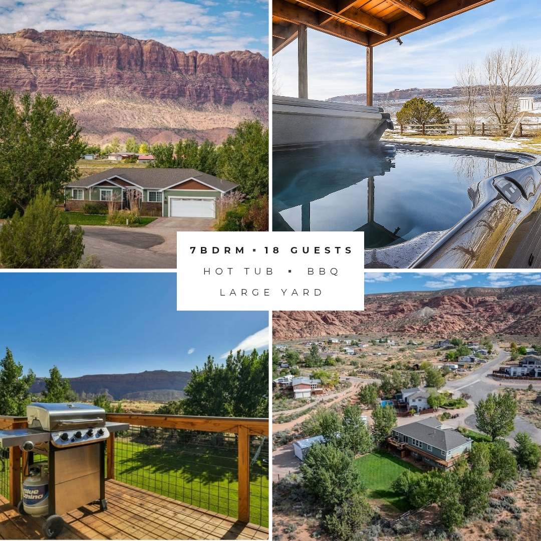 Our new Moab home is the perfect location for you to visit Utah’s most beautiful landscapes. Relax in the private hot tub w/ spectacular views of the Moab Rim & La Sal mountains. This modern 4-br, 3.5-bath home is brand new, well-appointed, has 3 king bedrooms (plus a bunk room), and is just minutes from Canyonlands & Arches National Parks. Featuring amenities like a massage chair, telescope, arcade machines, ping pong, yard games, & more. Your unforgettable vacation awaits!