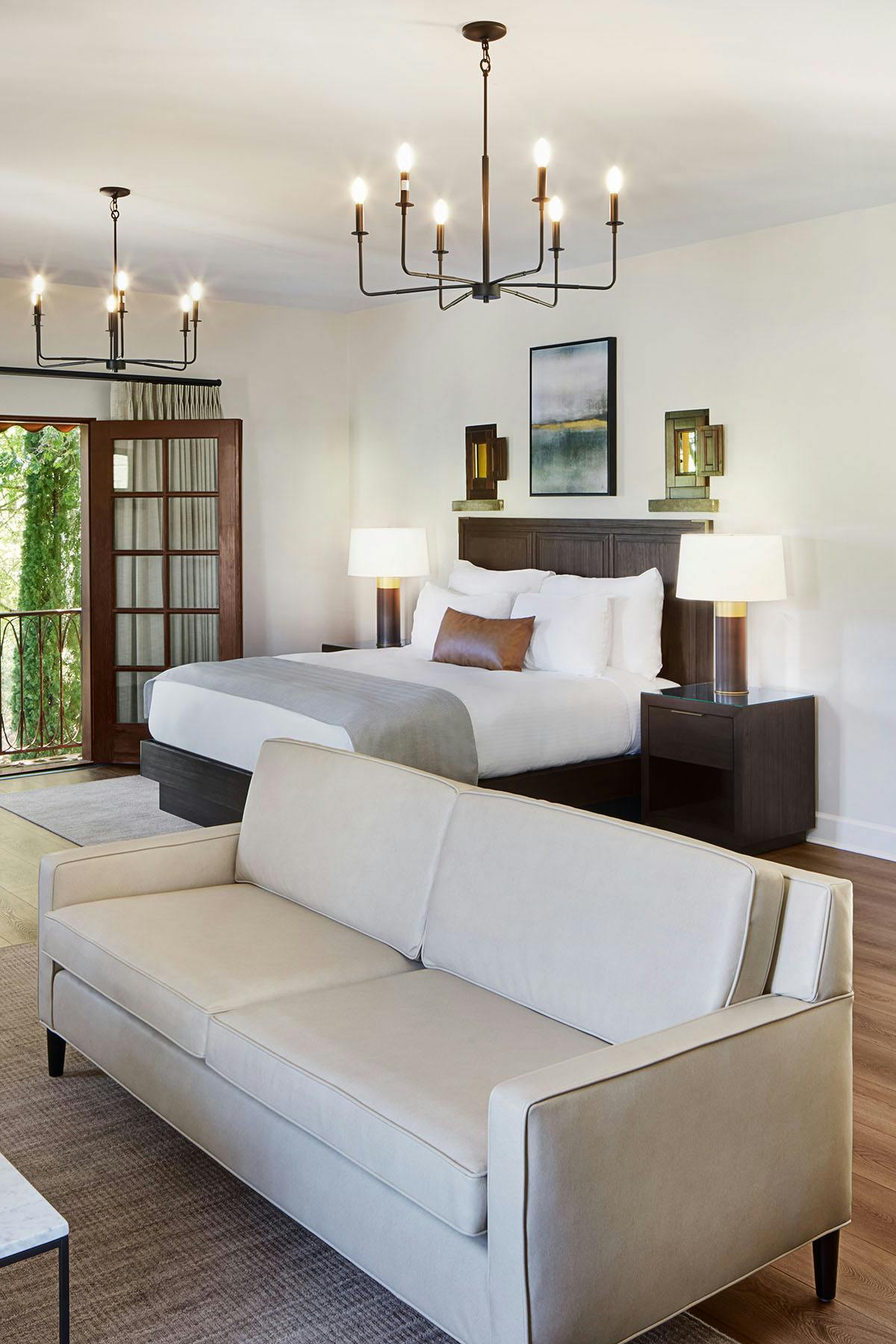 Mēs piedāvājam lieliskas naktsmītnes ģimenei un draugiem, kas ierodas pilsētā, jo piedāvājam vairāk vietas nekā jūsu tipiskajā viesnīcas numurā. Visi četri apartamenti, kuru platība ir no 1200 līdz 1500 kvadrātpēdām, var uzņemt līdz sešiem viesiem, un tajos ir trīs guļamistabas ar Kalifornijas karaļa gultām, trīs vannasistabas, plaša viesistaba, ēdamistaba, pilna izmēra gardēžu virtuve, kā arī veļas mazgājamā mašīna un žāvētājs. Mēbeles atspoguļo mūsu vīna lauku atrašanās vietu – modernu izsmalcinātību, kas akcentēta ar lauku detaļām.