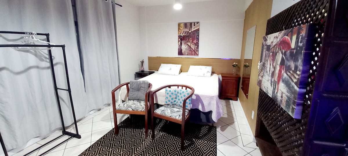 Šī studija ir skaista un mājīga, tajā ir 27 m², ļoti labi sadalīta ar lielisku komfortu un praktiskumu. Guļamistabā ir divguļamā gulta, gaisa kondicionētājs, sildītājs un telpa jūsu mantu novietošanai. Telpā ir 42collu televizors, un papildus kabeļtelevīzijas kanāliem ir straumes: Disney+, Star+ un Netflix. Atrašanās vieta ir lieliska, tikai 500 m attālumā no iepirkšanās centra, tirgiem, kafejnīcām un restorāniem. Mēs atrodamies labākajā vietā reģionā darbam vai apskates objektiem, šajā apkaimē jūs būsiet tuvu visam!