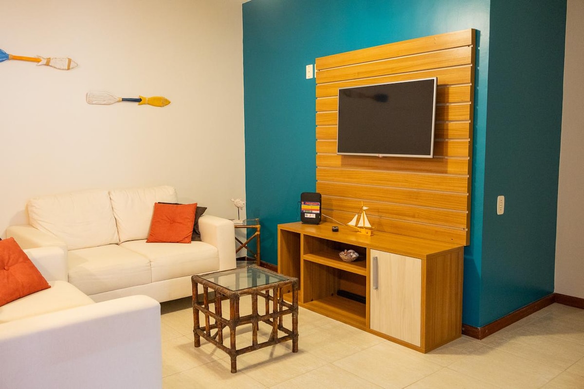 🏖️Aconchegante, labi izvietota un patīkama Pilnībā ✅aprīkota virtuve. ✅1 guļamistaba ar 01 vienu velosipēdu, iebūvētu balkona skapi ar skatu uz jūru. Blakus ir saviesīga vannasistaba. ✅1 guļamistaba( apartamenti)ar 1 divguļamo gultu , skapi , rakstāmgaldu, 02 grīdas matračiem, balkonu un ekskluzīvu vannasistabu. ✅Dzīvojamā istaba ar divguļamās gultas dīvānu un televizoru. ✅Ēdamistaba ar galdu, 06 krēsli, ✅Balkons ar skatu uz jūru. ✅skaista gardēžu zona ar baseinu un grilu. ✅ Garāža/ēka ar numuru