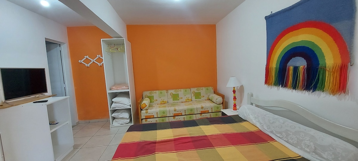 Neatkarīga studija 50 metru attālumā no Itaúna pludmales, kur notiek Pasaules sērfošanas čempionāts. Studija atrodas mājas augšstāvā, un tai var piekļūt pa āra kāpnēm. Tuvu restorāniem, tirgum, aptiekai un 3 km attālumā no pilsētas centra un autoostas. Mums ir virtuve ar mikroviļņu krāsni un mini bāru, Wi-Fi (80 MB), SmartTV, balkonu, šūpuļtīklu, gaisa kondicionētāju, griestu ventilatoru un elektrisko dušu. Gultasveļa, dvieļi, tualetes papīrs, ziepes, galda piederumi un trauki. Autostāvvieta mājas dārzā.