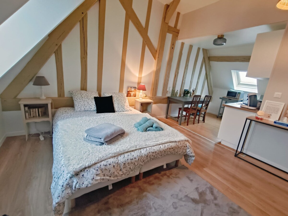 Laipni lūdzam šajā burvīgajā bēniņu studijā: Marcel Proust Studio Pilnībā atjaunots, tas atrodas Illiers-Combray centrā. Šī unikālā vieta, kas atrodas netālu no slavenā Marsela Prusta muzeja, jūs ieskauj izsmalcinātā rakstnieka pasaule. Iedvesmojoties no darba un dzīves, katra detaļa atspoguļo mūžīgo un smalko atmosfēru, kas iezīmēja tās laikmetu. Ideāla atrašanās vieta muzeja pakājē. Tajā ir aprīkota minivirtuve, divguļamā gulta un atsevišķa vannasistaba un tualete.